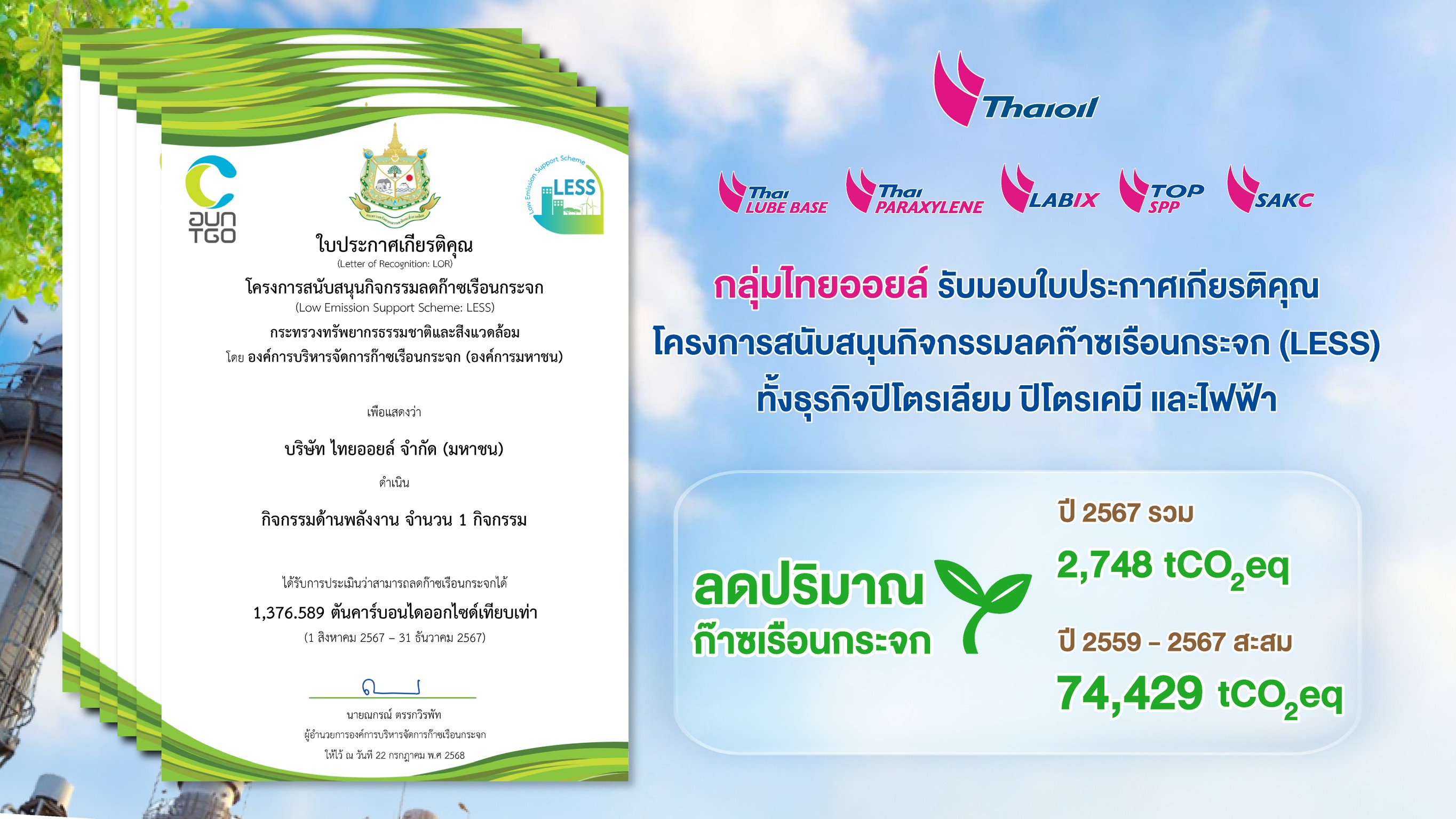 "กลุ่มไทยออยล์" รับมอบใบประกาศเกียรติคุณ โครงการ สนับสนุนกิจกรรมลดก๊าซเรือนกระจก (LESS)
