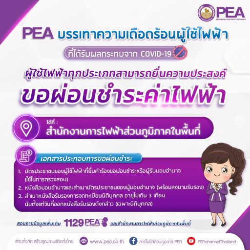 PEA ช่วยเหลือผู้ใช้ไฟฟ้าที่ได้รับผลกระทบ จากการระบาดของเชื้อไวรัส COVID-19