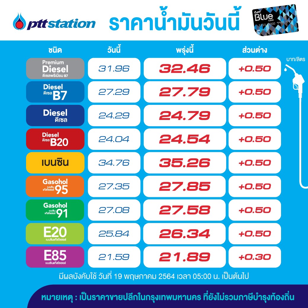 รีบเติมด่วน ! พรุ่งนี้ PTT Station - บางจาก ขึ้นราคาน้ำมันทุกชนิดขึ้น 0.50 บาทต่อลิตร เว้น E85 ปรับขึ้น 0.30