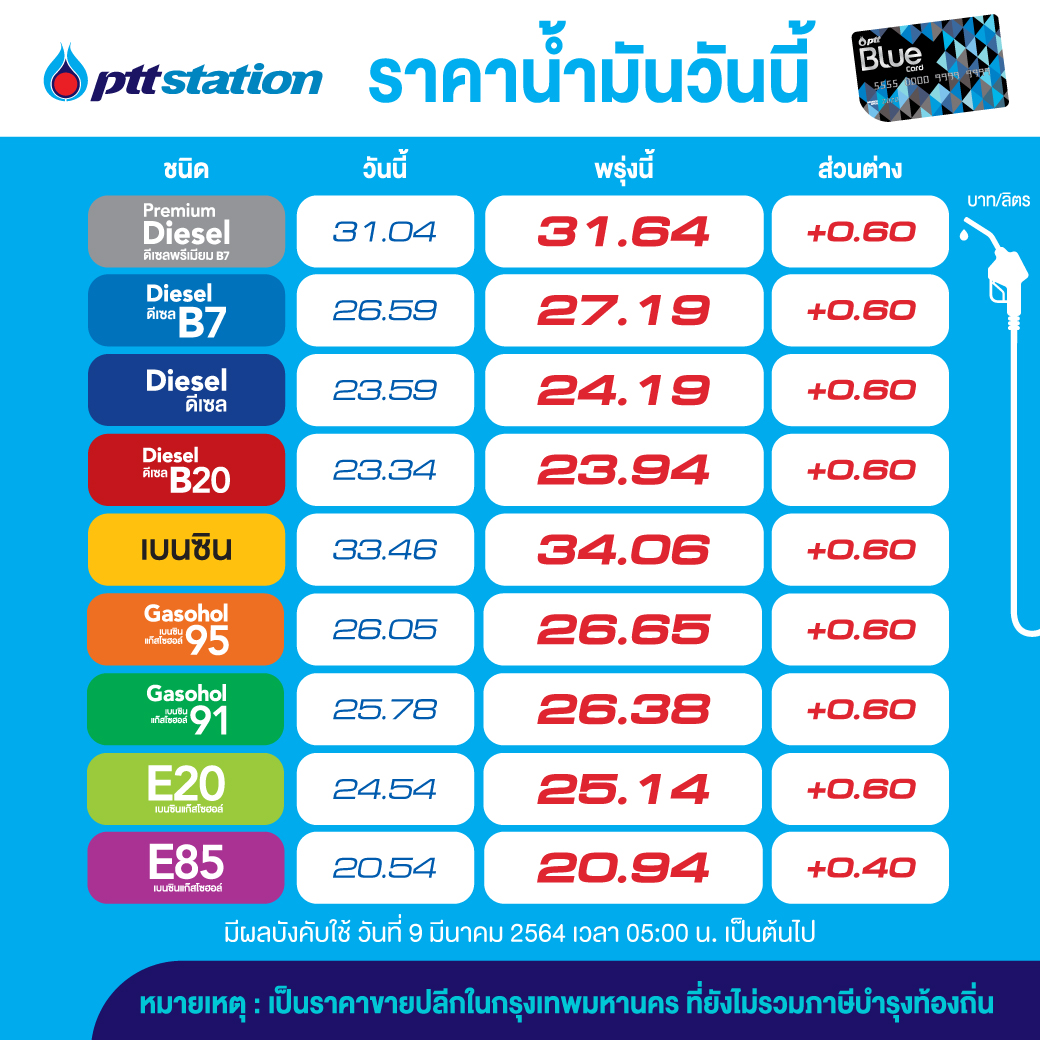 PTT Station ปรับราคาขายปลีกน้ำมันกลุ่มเบนซินและแก๊สโซฮอล์ทุกชนิดขึ้น 0.60 บาทต่อลิตร เว้นE85