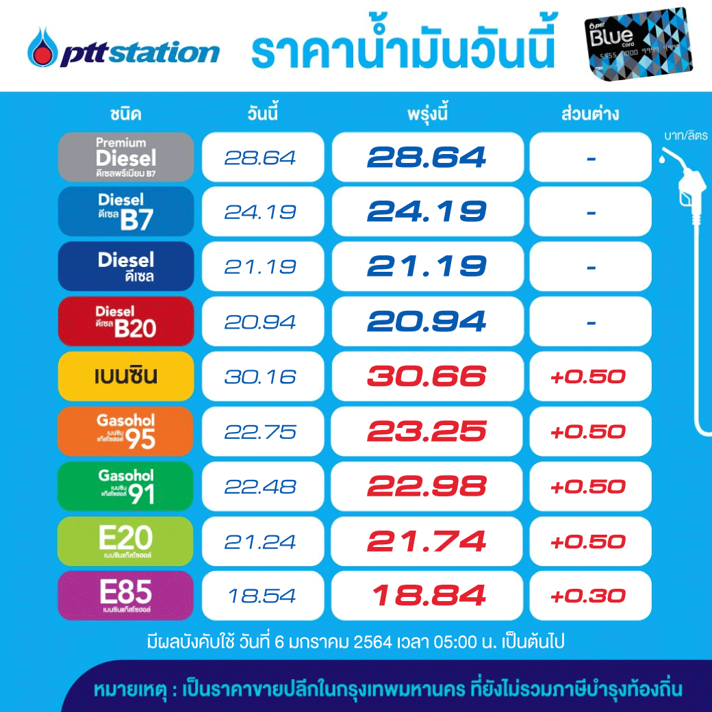 PTT Station - บางจาก ปรับราคาขายปลีกน้ำมันกลุ่มเบนซิน และแก๊สโซฮอล์ทุกชนิด เพิ่มขึ้น 0.50 บาทต่อลิตร