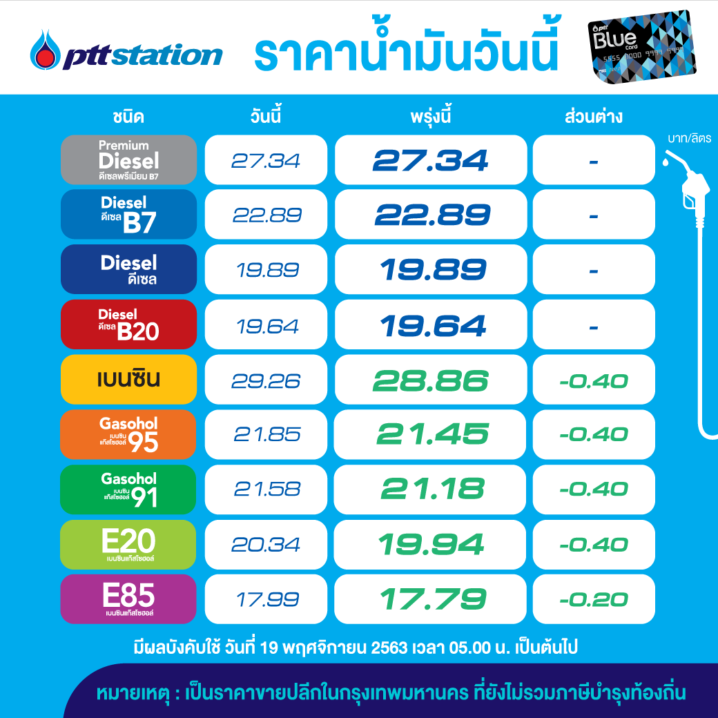 PTT Station ปรับราคาขายปลีกน้ำมันกลุ่มเบนซินและแก๊สโซฮอล์ทุกชนิดขึ้น 0.50 บาทต่อลิตร เว้น E85 ปรับขึ้น 0.30 บาทต่อลิตร ส่วนกลุ่มดีเซลทุกชนิด ปรับขึ้น 0.60 บาทต่อลิตร มีผล 12 พย. 2563 เวลา 05.00 น. เป็นต้นไป