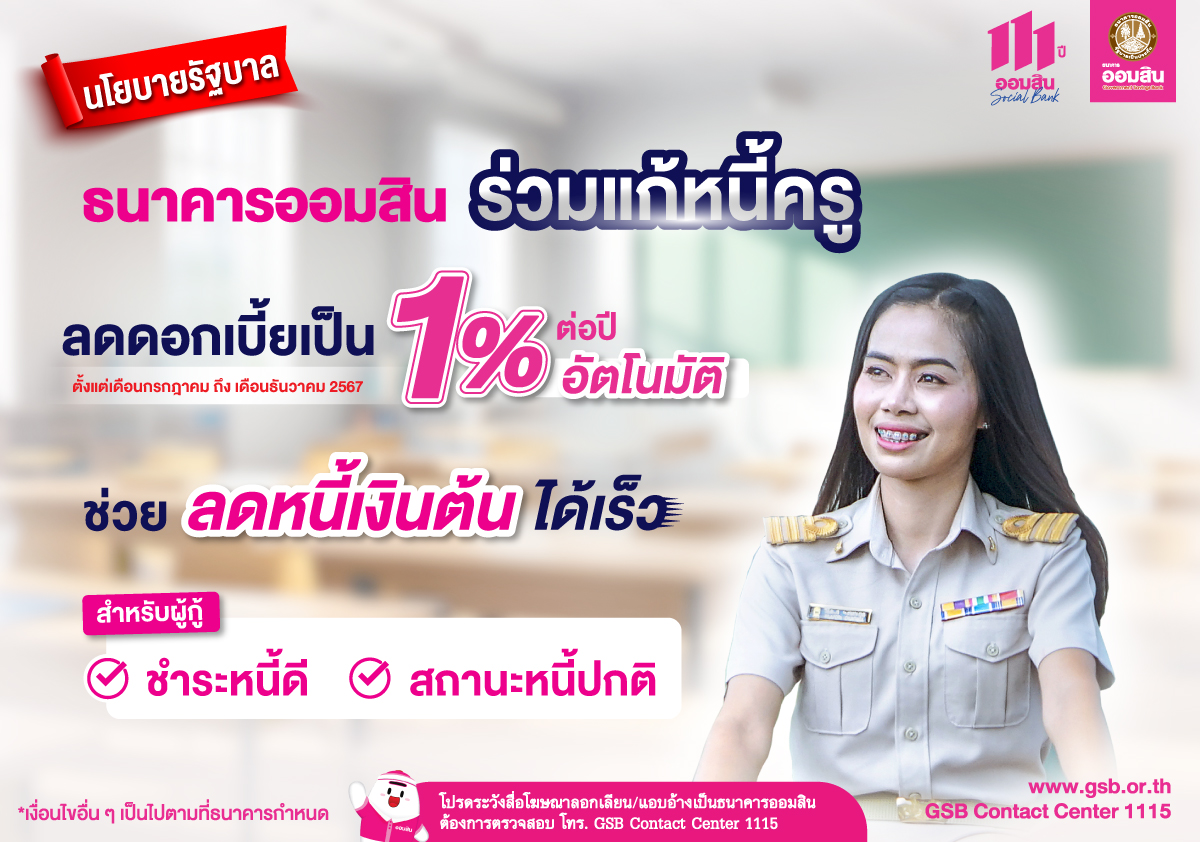 "ออมสิน" ลดดอกเบี้ย กลุ่มครูผ่อนดี เป็น 1% ต่อปี เป็นเวลา 6 เดือน เริ่ม ก.ค. นี้