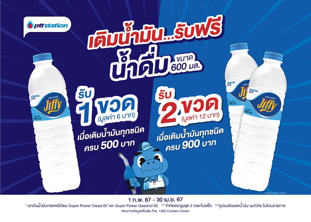 พีทีที สเตชั่น จัดโปร เติมน้ำมัน รับฟรีน้ำดื่ม เมื่อเติม XTRA SAVE ทุกชนิดครบ 500 บาท/ใบเสร็จ รับฟรีน้ำดื่มจิฟฟี่ จำนวน 1 ขวด