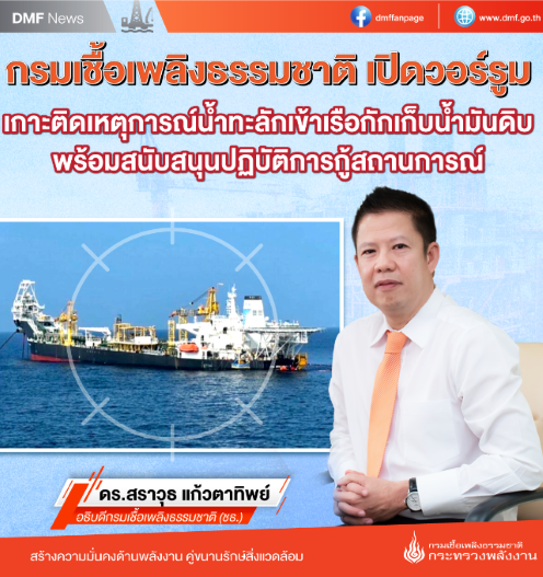 กรมเชื้อเพลิงธรรมชาติ เปิดวอร์รูมเกาะติดเหตุการณ์น้ำทะลักเข้าเรือกักเก็บน้ำมันดิบ พร้อมสนับสนุนปฏิบัติการกู้สถานการณ์