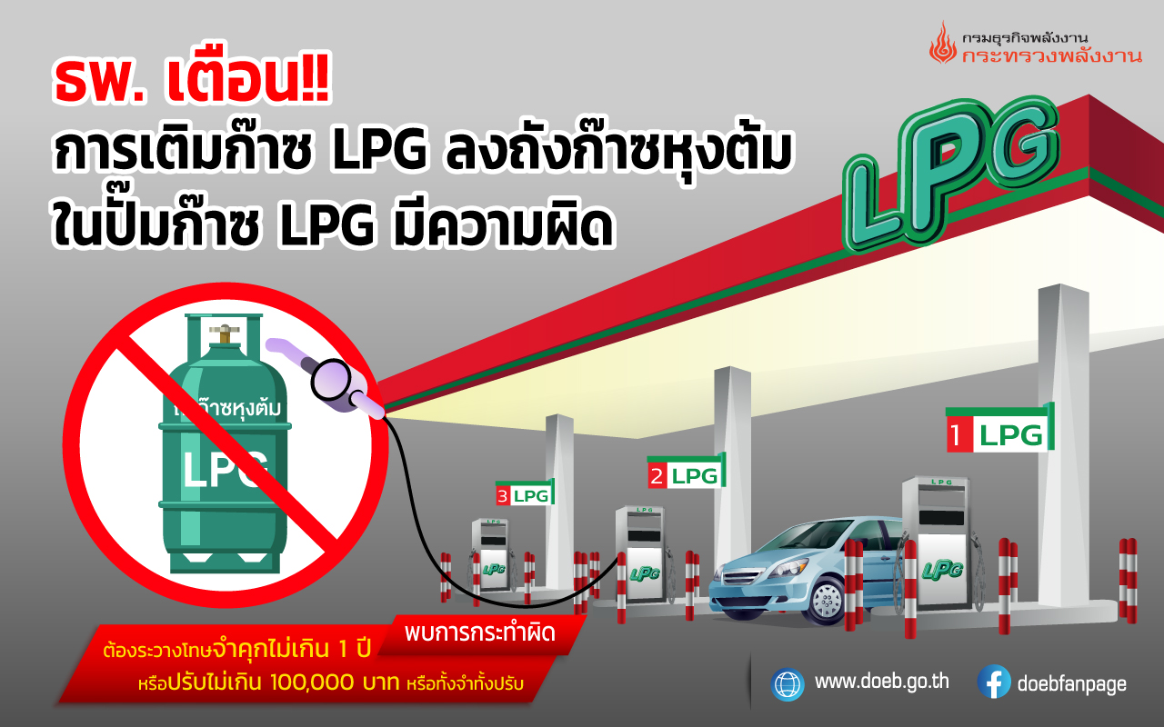 ธพ. เตือน การเติมก๊าซ LPG ลงถังก๊าซหุงต้ม ในปั๊มก๊าซ LPG มีความผิด