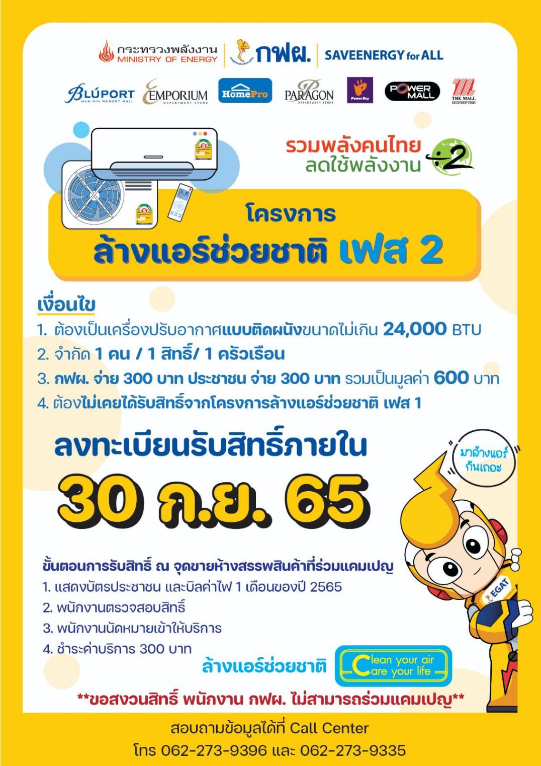 กฟผ. ชวนล้างแอร์ช่วยชาติเฟส 2 ลงทะเบียนรับสิทธิ์ภายใน 30 กันยายน 2565 นี้