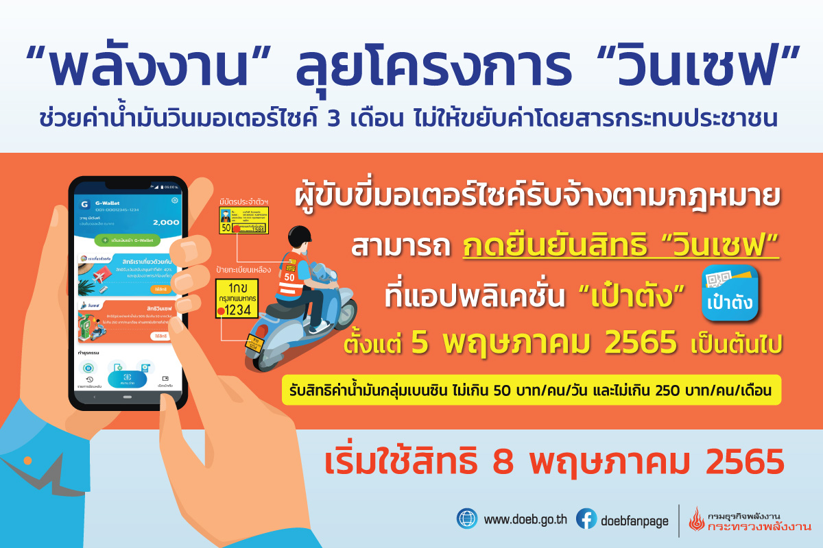 “พลังงาน” ลุยโครงการ “วินเซฟ” ช่วยค่าน้ำมันวินมอเตอร์ไซค์ 3 เดือน ไม่ให้ขยับค่าโดยสารกระทบประชาชน