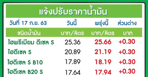 18 กันยายน 63 เวลา 05.00 น. บางจากฯ ปรับราคาน้ำมันกลุ่มแก๊สโซฮอล์ทุกชนิด +50 สต. ยกเว้น E85 +30 สต. และกลุ่มดีเซลทุกชนิด +30 สต.