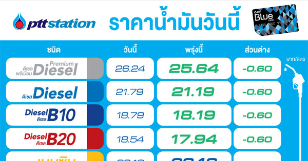 PTT Station ปรับลดราคาขายปลีกน้ำมันกลุ่มดีเซลทุกชนิดลง 0.60 บาทต่อลิตร