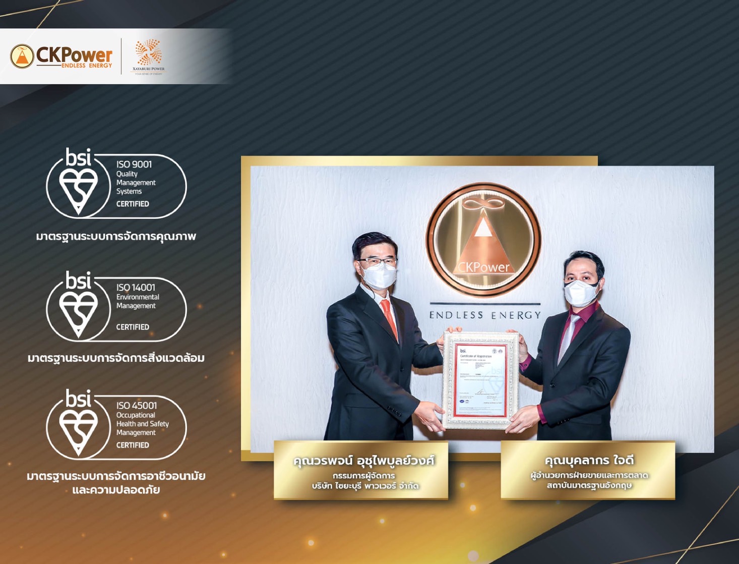 บริษัทในเครือของ บริษัท ซีเค พาวเวอร์ จำกัด (มหาชน) (CKPower) ชื่อย่อหลักทรัพย์ “CKP” จำนวน 2 แห่ง ได้แก่ บริษัท ไซยะบุรี พาวเวอร์ จำกัด (XPCL) ผู้บริหารโรงไฟฟ้าพลังน้ำ ไซยะบุรี และ บริษัท ไฟฟ้าน้ำงึม 2 จำกัด (NN2) ผู้บริหารโรงไฟฟ้าพลังน้ำ น้ำงึม 2 ใน สปป. ลาว ประสบความสำเร็จอีกระดับ ได้รับ ISO จากสถาบันมาตรฐานอังกฤษ (British Standards Institution หรือ BSI) รวม 4 ใบ สะท้อนให้เห็นถึงกระบวนการทำงานที่มีประสิทธิภาพของบริษัทในเครือ CKPower ตลอดจนมาตรฐานการดำเนินงานเทียบเท่าระดับสากล