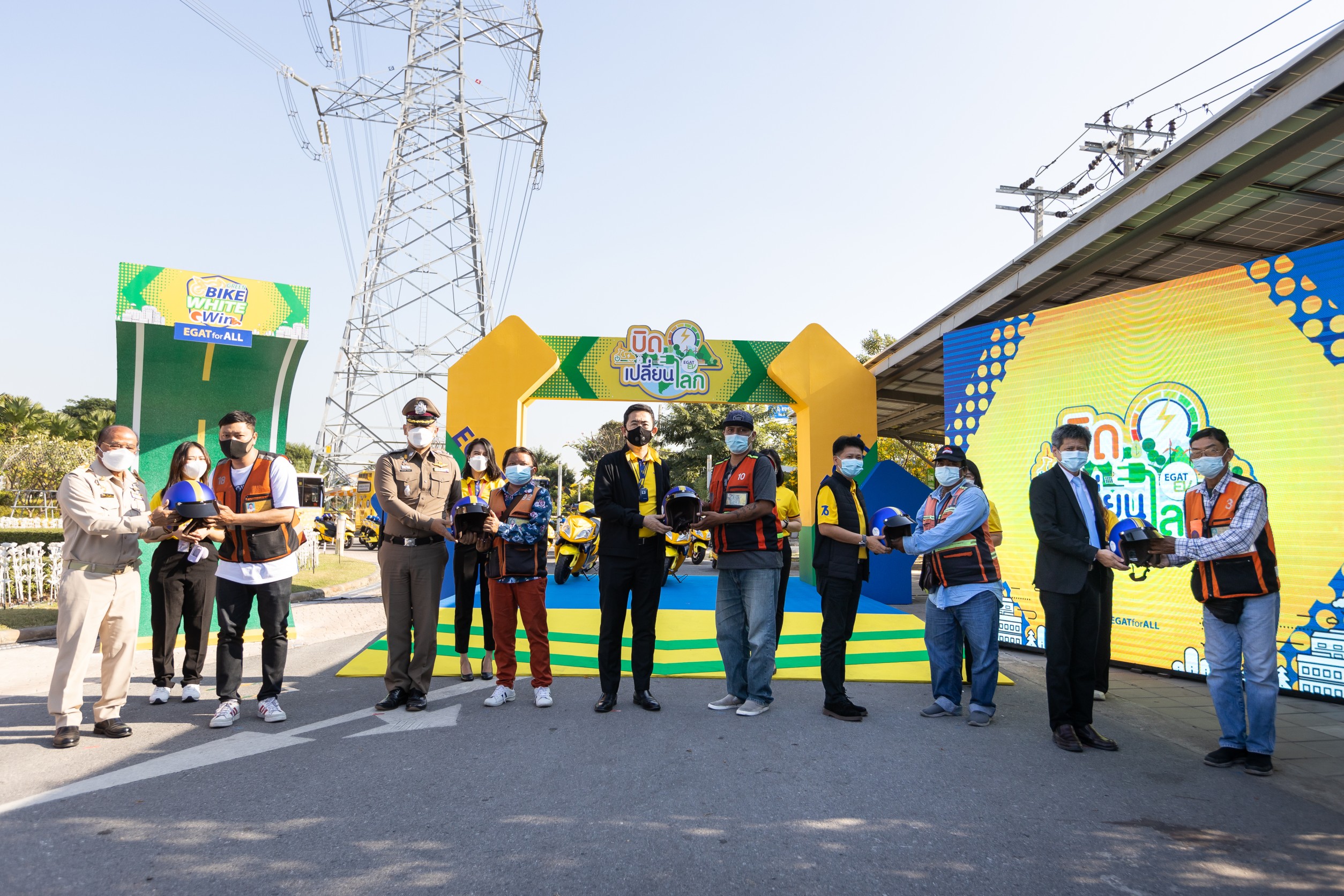 นายบุญญนิตย์ วงศ์รักมิตร ผู้ว่าการ กฟผ. เปิดเผยว่า การเดินหน้านำร่องรถจักรยานยนต์ไฟฟ้ารับจ้างสาธารณะในพื้นที่อำเภอบางกรวยเป็นหนึ่งในการดำเนินงานเพื่อสนับสนุนนโยบาย EGAT Carbon Neutrality ลดปัญหาการปล่อยมลพิษทางอากาศและฝุ่น PM 2.5 จากภาคการขนส่ง รวมถึงการยกระดับคุณภาพชีวิตของประชาชน โดยวันนี้ กฟผ. ได้ส่งมอบรถจักรยานยนต์ไฟฟ้า ENGY ซึ่งเป็นรถจักรยานยนต์ไฟฟ้าเบอร์ 5 ภายใต้แบรนด์ กฟผ. และได้รับการจดทะเบียนสาธารณะอย่างถูกต้องจำนวน 51 คัน ให้แก่ผู้ขับขี่รถจักรยานยนต์รับจ้างสาธารณะเพื่อทดลองให้บริการประชาชนเป็นระยะเวลา 1 ปี ซึ่งมหาวิทยาลัยเทคโนโลยีพระจอมเกล้าพระนครเหนือและ กฟผ. จะศึกษาข้อมูลพฤติกรรมการใช้งานของผู้ขับขี่ ผลกระทบด้านพลังงาน เศรษฐกิจ สังคม ชุมชน และสิ่งแวดล้อม รวมถึงความพึงพอใจของผู้ใช้บริการ เพื่อขยายผลสู่รถรับจ้างสาธารณะทั่วประเทศ สำหรับรถจักรยานยนต์ไฟฟ้า ENGY ขับเคลื่อนด้วยมอเตอร์ไฟฟ้า 3 กิโลวัตต์ วิ่งได้ระยะทาง 100 กิโลเมตร ต่อการชาร์จ 1 ครั้ง ทำความเร็วสูงสุด 80 กิโลเมตรต่อชั่วโมง รับน้ำหนักได้มากกว่า 150 กิโลกรัม มีการติดตั้งระบบ GPS Tracking เพื่อติดตามตำแหน่งของรถ และระบบควบคุมความปลอดภัย ระบบตัดคันเร่งเมื่อนำขาตั้งลง ทำให้ผู้ขับขี่และผู้รับบริการเกิดความรู้สึกมั่นใจ