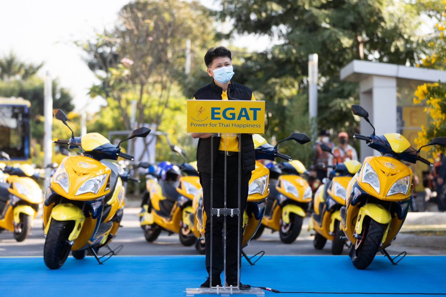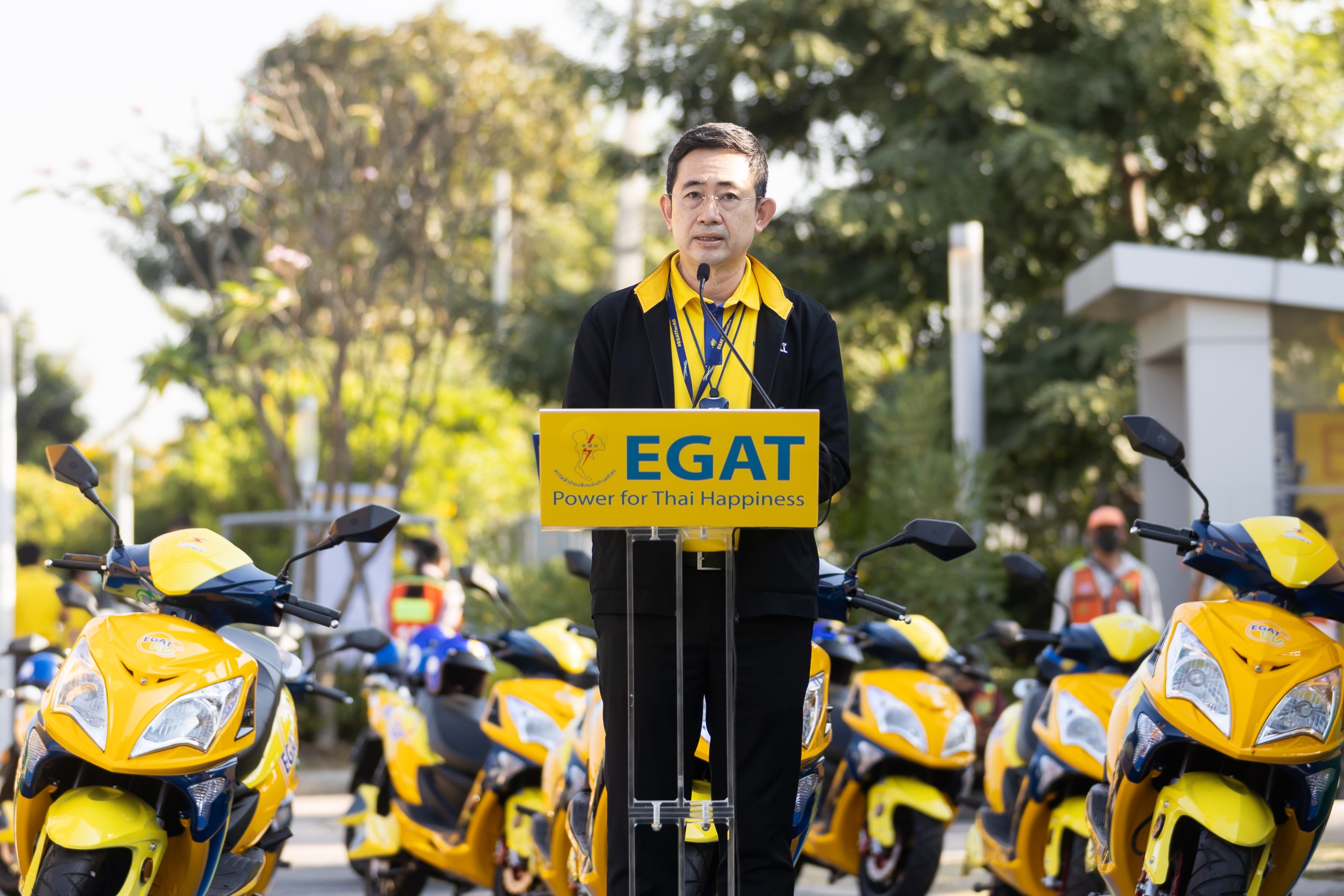 นายบุญญนิตย์ วงศ์รักมิตร ผู้ว่าการการไฟฟ้าฝ่ายผลิตแห่งประเทศไทย (กฟผ.) พร้อมด้วยนางสาวรฌทร สงวนพงศ์ ร่วมส่งมอบจักรยานยนต์ไฟฟ้าเบอร์ 5 ให้แก่ผู้ขับขี่รถจักรยานยนต์รับจ้างสาธารณะในพื้นที่บางกรวย จำนวน 51 คัน ณ ศูนย์การเรียนรู้ กฟผ. สำนักงานกลาง อ.บางกรวย จ.นนทบุรี
