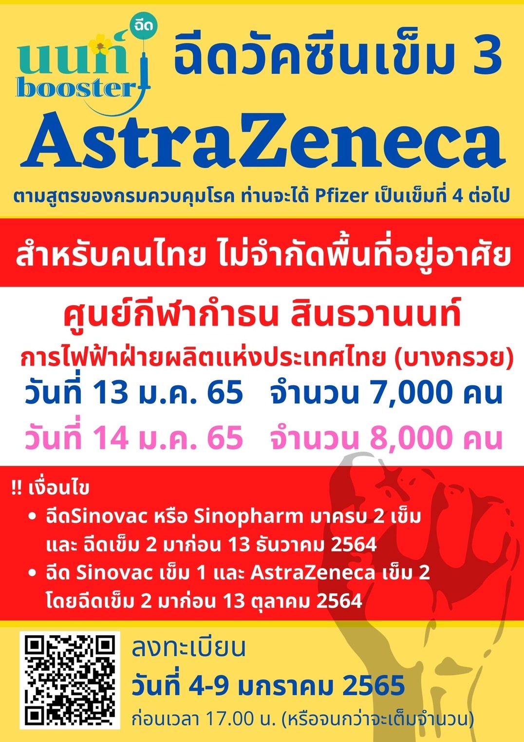 ปัจจุบันศูนย์ฯ เปิดให้บริการฉีดวัคซีนกระตุ้นเข็ม 3 (Booster) ซึ่งได้รับความสนใจจากประชาชนเป็นจำนวนมาก กฟผ. จึงสนับสนุน “นนท์พร้อม” เปิดศูนย์ฉีดวัคซีนกระตุ้นเข็ม 3 (Booster) รอบใหม่ ซึ่งจะรองรับประชาชนได้ถึง 15,000 คน ในวันที่ 13 มกราคม (7,000 คน) และ 14 มกราคม (8,000 คน) ด้วยวัคซีน AstraZeneca สำหรับคนไทยไม่จำกัดพื้นที่อยู่อาศัย แต่ต้องเป็นไปตามเงื่อนไข คือ ฉีด Sinovac หรือ Sinopharm มาครบ 2 เข็ม และ ฉีดเข็ม 2 มาก่อน 13 ธันวาคม 2564 หรือฉีด Sinovac เข็ม 1 และ AstraZeneca เข็ม 2 โดยฉีดเข็ม 2 มาก่อน 13 ตุลาคม 2564 โดยสามารถลงทะเบียนฉีดวัคซีนกระตุ้นเข็ม 3 ผ่าน www.นนท์พร้อม.com ตั้งแต่วันนี้ – 9 มกราคม 2565 ก่อนเวลา 17.00น. หรือจนกว่าจะเต็มจำนวน พร้อมเข้ารับวัคซีนในวันที่ 13 – 14 มกราคม 2565 ณ ศูนย์กีฬากำธน สินธวานนท์ กฟผ. สำนักงานกลาง อ.บางกรวย จ.นนทบุรี