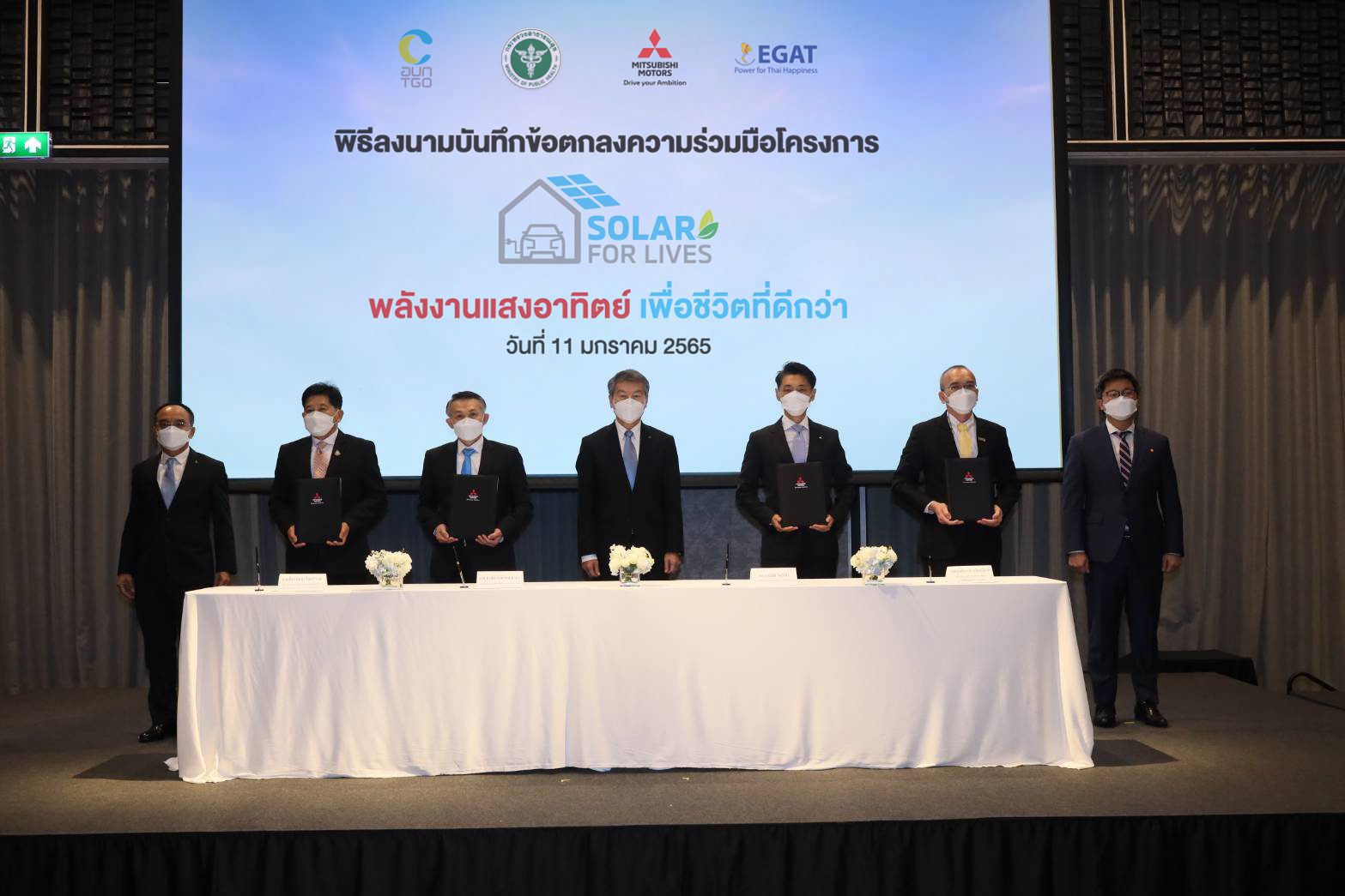 บริษัท มิตซูบิชิ มอเตอร์ส (ประเทศไทย) จำกัด ได้จัดพิธีลงนามบันทึกข้อตกลงความร่วมมือ (MoU) กับกระทรวงสาธารณสุข การไฟฟ้าฝ่ายผลิตแห่งประเทศไทย (กฟผ.) และองค์การบริหารจัดการก๊าซเรือนกระจก (องค์การมหาชน) (อบก.) เพื่อริเริ่มโครงการด้านสิ่งแวดล้อม “Solar for Lives: พลังงานแสงอาทิตย์เพื่อชีวิตที่ดีกว่า” โดย มิตซูบิชิ มอเตอร์ส ประเทศไทย จะทำหน้าที่ในการติดตั้งระบบแผงพลังงานแสงอาทิตย์ หรือ แผงโซลาร์ เพื่อช่วยผลิตพลังงานไฟฟ้าให้แก่โรงพยาบาลชุมชนต่างๆ ในพื้นที่ทั่วประเทศ