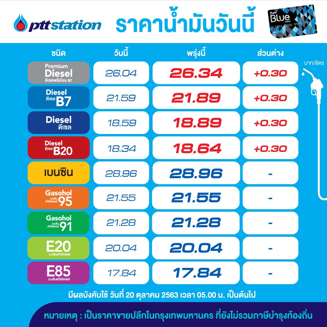 PTT Station ปรับราคาขายปลีกน้ำมันกลุ่มดีเซลทุกชนิดขึ้น 0.30 บาทต่อลิตร ส่วนกลุ่มเบนซินและแก๊สโซฮอลล์ทุกชนิด คงเดิม มีผล 20 ต.ค. 2563 เวลา 05.00 น. เป็นต้นไป โดยราคาขายปลีกจะเป็นดังนี้ ULG = 28.96, GSH95 = 21.55, E20 = 20.04, GSH91 = 21.28, E85 = 17.84, HSD-B7 = 21.89, HSD-B10 = 18.89, HSD-B20 = 18.64, ดีเซลพรีเมี่ยม B7 = 26.34 บาทต่อลิตร โดยราคาขายปลีกข้างต้นยังไม่รวมภาษีบำรุงกรุงเทพมหานคร