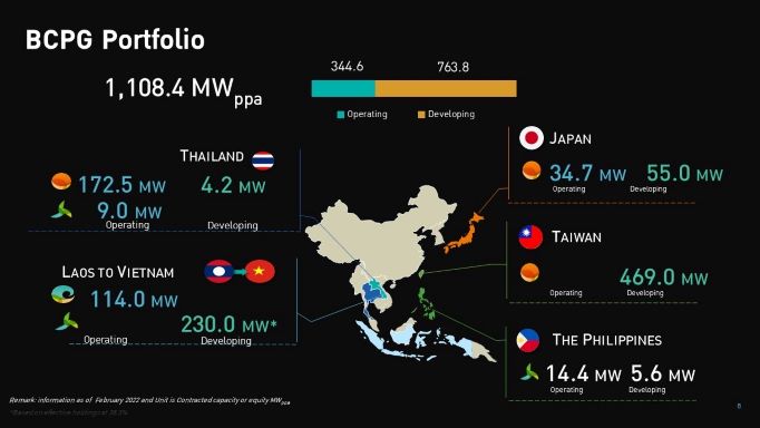 ปัจจุบัน บีซีพีจี มีกำลังการผลิตทั้งหมด 1,108 เมกะวัตต์ เปิดดำเนินการเชิงพาณิชย์ (COD) เรียบร้อยแล้ว 345 เมกะวัตต์ อยู่ระหว่างพัฒนา 764 เมกะวัตต์ ซึ่งคาดว่าจะสามารถเปิดดำเนินการเชิงพาณิชย์ได้ ทั้งหมดภายในปี 2567 ล่าสุดทางบริษัทฯ ได้ลงนามในบันทึกข้อตกลง (Memorandum of Agreement) กับ Capital Asia Investments Pte. Ltd. (CAI) (ในฐานะผู้ร่วมลงทุนกับบริษัทฯ) และกระทรวงการเงิน สปป. ลาว ในนามของรัฐบาล สปป. ลาว (GOL) การร่วมลงทุนกับ CAI ในวงเงินลงทุนไม่เกิน 100 ล้านเหรียญสหรัฐในครั้งนี้ เพื่อให้ได้มาซึ่งสิทธิ การลงทุนในธุรกิจพลังงานหมุนเวียนใน สปป. ลาว ผ่านวิสาหกิจถือหุ้นลาว (Lao State Holding Enterprise หรือ LHSE ) และ การให้บริการให้คำปรึกษาด้านการบริหารจัดการธุรกิจพลังงานหมุนเวียนแก่ LHSE ภายใต้ข้อกำหนดและเงื่อนไขที่จะตกลงกันต่อไป
