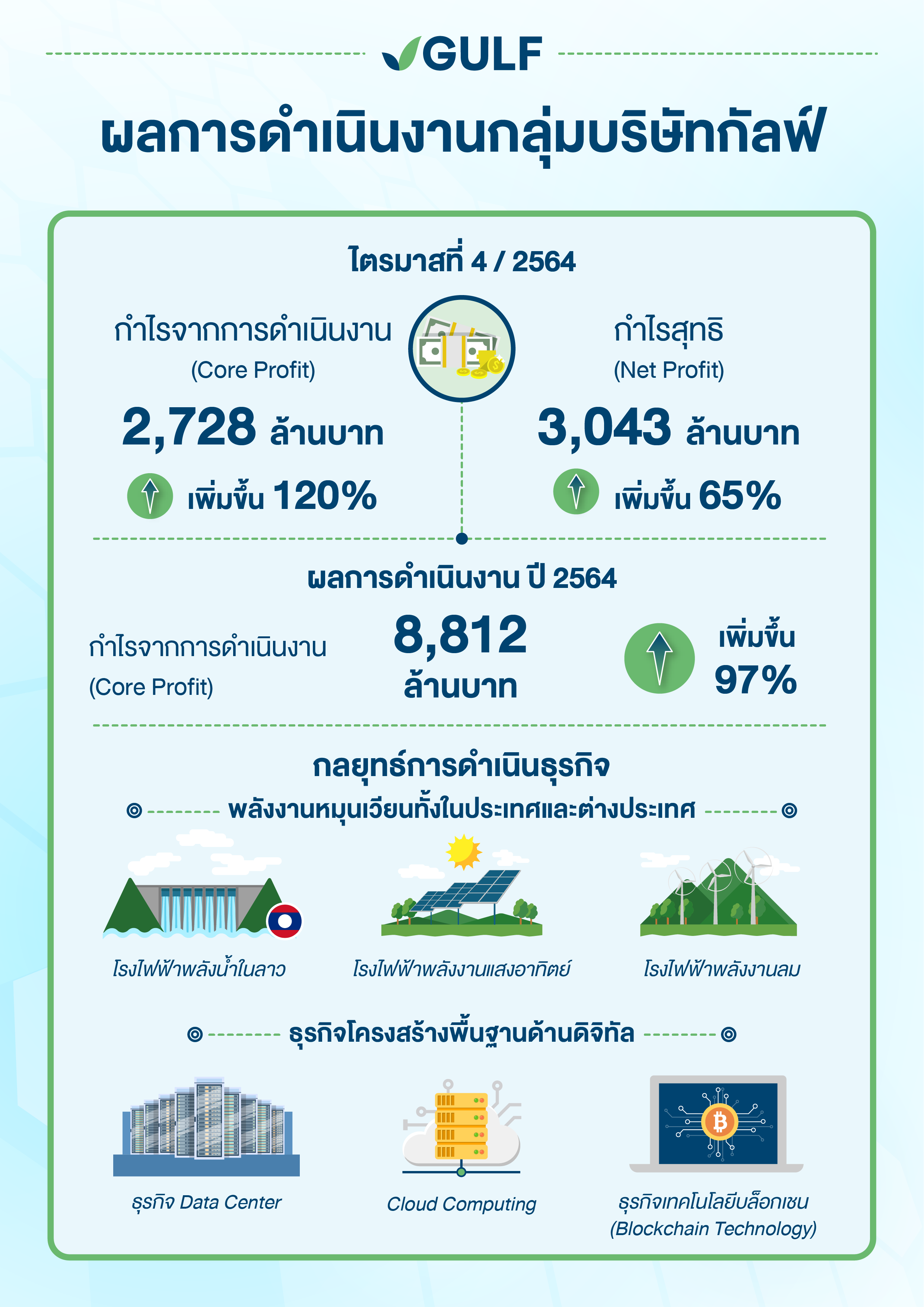 GULF เผยกำไรจากการดำเนินงานปี 2564 เท่ากับ 8,812 ล้านบาท เพิ่มขึ้น 97% เทียบกับปีก่อน สูงสุดเป็นประวัติการณ์