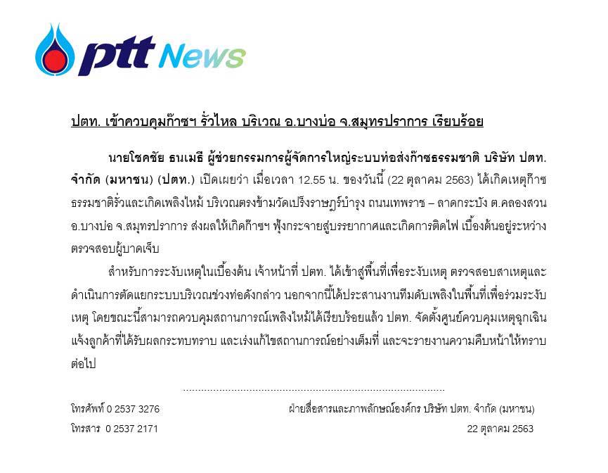 นายโชคชัย ธนเมธี ผู้ช่วยกรรมการผู้จัดการใหญ่ระบบท่อส่งก๊าซธรรมชาติ บริษัท ปตท. จำกัด (มหาชน) (ปตท.) เปิดเผยว่า เมื่อเวลา 12.55 น. ของวันนี้ (22 ตุลาคม 2563) ได้เกิดเหตุก๊าซธรรมชาติรั่วและเกิดเพลิงไหม้ บริเวณตรงข้ามวัดเปร็งราษฎร์บำรุง ถนนเทพราช – ลาดกระบัง ต.คลองสวน