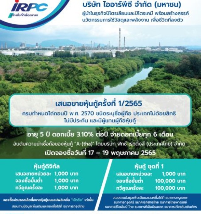 บริษัท ไออาร์พีซี จำกัด (มหาชน) หรือ IRPC เตรียมออกและเสนอขายหุ้นกู้ในเดือนพฤษภาคมนี้ ให้แก่ผู้ลงทุนทั่วไป ผู้ลงทุนสถาบัน และ/หรือ ผู้ลงทุนรายใหญ่ ผ่าน 8 สถาบันการเงิน โดยหุ้นกู้ได้รับการจัดอันดับความน่าเชื่อถือระดับ A-(tha) จากฟิทช์ เรทติ้งส์ (ประเทศไทย) สะท้อนถึงความได้เปรียบในการแข่งขันในฐานะบริษัทที่ดำเนินธุรกิจปิโตรเลียมและธุรกิจปิโตรเคมีแบบครบวงจร ที่พร้อมเดินหน้ารุกธุรกิจใหม่ ต่อยอดความแข็งแกร่งให้ธุรกิจปัจจุบัน ด้วยนวัตกรรมวัสดุและการใช้พลังงาน ที่สร้างสมดุลทั้งในด้านสังคม สิ่งแวดล้อม และธรรมาภิบาล