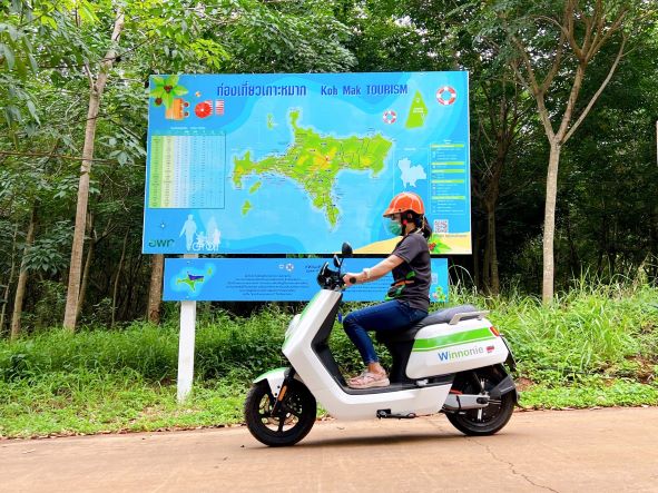 การสนับสนุนมอเตอร์ไซค์ไฟฟ้า Winnonie ให้กับ อบต. เกาะหมากและผู้ประกอบการในพื้นที่ทดลองใช้ เป็นหนึ่งในแนวทางการร่วมขับเคลื่อนให้เกาะหมากเป็นแหล่งท่องเที่ยวคาร์บอนต่ำแห่งแรกของไทย ริเริ่มโดยองค์การบริหารการพัฒนาพื้นที่พิเศษเพื่อการท่องเที่ยวอย่างยั่งยืน (อพท.) และเป็นการต่อยอดจากการดำเนินการศึกษาการดูดซับและกักเก็บก๊าซเรือนกระจกในทะเลด้วย Blue Carbon จากแหล่งหญ้าทะเล มุ่งสู่เป้าหมายการเป็นแหล่งท่องเที่ยวคาร์บอนต่ำ ครอบคลุมกิจกรรมทั้งบนบกและในทะเล ภายใต้เป้าหมายการสร้างความยั่งยืนและลดการปล่อยก๊าซเรือนกระจกสู่ชั้นบรรยากาศ