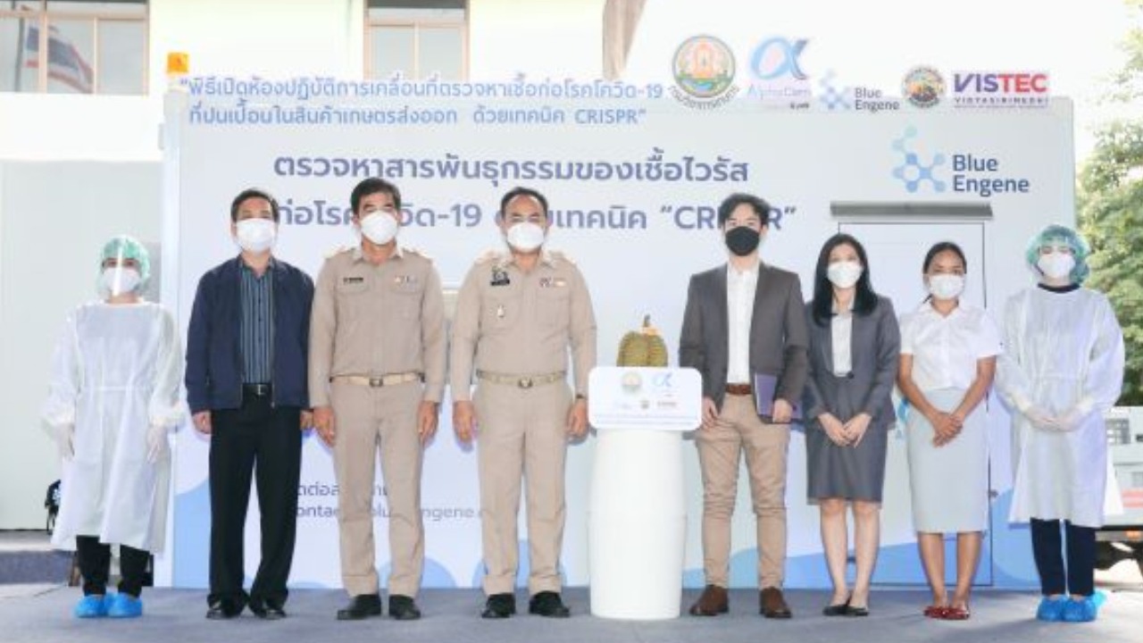 นายสุธี ทองแย้ม ผู้ว่าราชการจังหวัดจันทบุรี (ที่ 4 จากซ้าย) นายชลธี นุ่มหนู ผู้อำนวยการสำนักวิจัยและพัฒนาการเกษตรเขตที่ 6 (ที่ 3 จากซ้าย) นายไกรยสิทธิ์ อินทรพาณิชย์ ผู้ช่วยกรรมการผู้จัดการใหญ่พัฒนาธุรกิจโลจิสติกส์และโครงสร้างพื้นฐาน บริษัท ปตท. จำกัด (มหาชน) (ที่ 2 จากซ้าย) นายคเณศ กาญจนแก้ว กรรมการผู้จัดการบริษัท อัลฟ่า คอม จำกัด (ที่ 4 จากขวา) ดร.พรรณวิกา พรรณโณภาศ นักวิจัยวิทยาศาสตร์ ศูนย์วิจัยวิทยาศาสตร์และเทคโนโลยีชั้นแนวหน้า (FRC) สถาบันวิทยสิริเมธี (VISTEC) (ที่ 3 จากขวา) และดร. วนิดา เพ็ชรสังข์ ผู้อำนวยการโครงการ BLUE ENGENE บริษัท อัลฟ่า คอม จำกัด (ที่ 2 จากขวา) ร่วมพิธีเปิด “ห้องปฏิบัติการเคลื่อนที่ (Mobile lab) ตรวจหาเชื้อก่อโรคโควิด-19 ที่ปนเปื้อนในสินค้าเกษตรส่งออก ด้วยเทคนิค CRISPR”