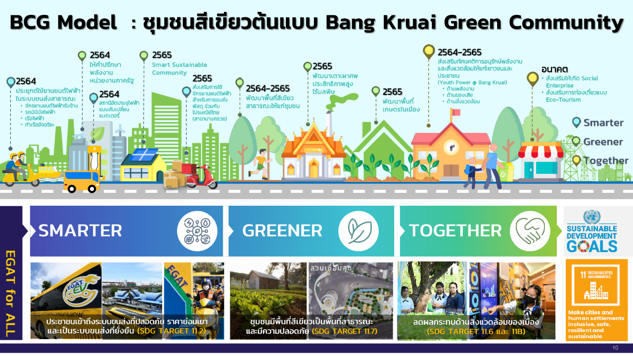 3) ด้านโมเดลเศรษฐกิจ BCG ที่เกี่ยวข้องกับชุมชนโดยเร่งดำเนินการโครงการต้นแบบ Bang Kruai Green Community ด้วยหลักคิด Smarter, Greener และ Together พัฒนาพื้นที่ชุมชนสีเขียว นำเทคโนโลยี และนวัตกรรมด้านพลังงานไฟฟ้ามาประยุกต์ใช้นำร่องในชุมชน อ.บางกรวย จ.นนทบุรี เพื่อยกระดับคุณภาพชีวิตความเป็นอยู่ของชุมชนอย่างยั่งยืน