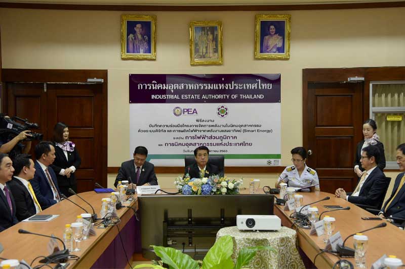 PEA ร่วมลงนาม การนิคมอุตสาหกรรมแห่งประเทศไทย (กนอ.) จัดการพลังงานในนิคมอุตสาหกรรมด้วยระบบดิจิทัล (Digital Platform) และการผลิตไฟฟ้าจากพลังงานแสงอาทิตย์ (Smart Energy) เพื่อยกระดับการผลิตพลังงานและการบริหารจัดการพลังงานภายในนิคมอุตสาหกรรม โดยการนำเทคโนโลยีการผลิตไฟฟ้าจากพลังงานทดแทนและระบบตรวจวัดการใช้พลังงานมาประยุกต์ใช้ ในระบบโครงข่ายสำหรับส่งไฟฟ้าอัจฉริยะแบบครบวงจรโดยใช้เทคโนโลยีดิจิทัล (Smart Grid) ช่วยให้สามารถบริหารจัดการการใช้พลังงานไฟฟ้าได้อย่างมีประสิทธิภาพ โดยระบบการส่งจ่ายไฟฟ้าได้พัฒนาโปรแกรม พร้อมกับติดตั้งอุปกรณ์ที่สามารถตรวจสอบการใช้ไฟฟ้าได้ตามเวลาจริง (Real Time) เพื่อช่วยคำนวณการจ่ายกระแสไฟฟ้าทำให้การจ่ายกระแสไฟฟ้ามีความเสถียร ลดปัญหาไฟดับในช่วงที่มีการใช้ไฟสูง โดยระบบดังกล่าวไม่เพียงแค่ประหยัดค่าใช้จ่าย ลดต้นทุนในการผลิตแล้ว ยังมุ่งเน้นไปในด้านสิ่งแวดล้อมและการจัดการพลังงานทดแทน