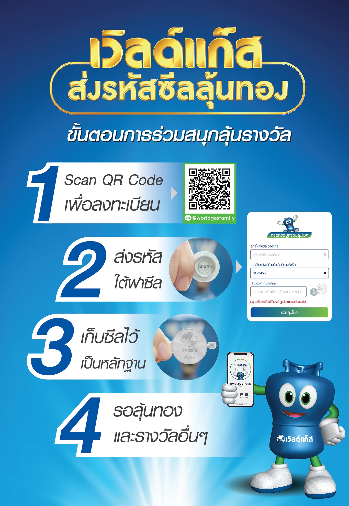 ส่งผลให้แบรนด์เวิลด์แก๊สเติบโตได้อย่างต่อเนื่องและมั่นคงตลอดมา ผ่านเงื่อนไข: เมื่อซื้อก๊าซหุงต้มเวิลด์แก๊สขนาด 8, 15 และ 48 กิโลกรัม ณ ร้านค้าตัวแทนจำหน่ายก๊าซหุงต้มเวิลด์แก๊สทั่วประเทศที่ใช้ซีลใหม่สีเงินเมทัลลิก แล้วนำรหัส 10 หลักบนซีลมาลงทะเบียนร่วมสนุกผ่านทาง Line Official Account : @worldgasfamily พร้อมลงทะเบียนด้วยข้อมูลส่วนบุคคลให้ครบถ้วนถูกต้อง ก็มีสิทธิ์ลุ้นรับรางวัลใหญ่ เช่น ทองคำรูปพรรณ iPhone 13 Pro 256GB สกู๊ตเตอร์ไฟฟ้า Segway และของรางวัลอื่น ๆ จำนวนทั้งสิ้น 114 รางวัล มูลค่ารวมกว่า 2 ล้านบาท โดยจะมีการจับรางวัล ในวันที่ 7 ธันวาคม 2565 และประกาศผลผ่านทาง Line OA @worldgasfamily ในวันที่ 16 ธันวาคม 2565 และในอนาคต ดับบลิวพี เอ็นเนอร์ยี่ จะยังคงเดินหน้าในการเสริมความแข็งแกร่งทางธุรกิจตามเป้าหมายที่ได้วางไว้ พร้อมด้วยวิสัยทัศน์เคียงข้างสร้างรอยยิ้มในการใช้ชีวิตของคนไทยต่อไปอย่างแน่นอน” คุณชมกมล กล่าวสรุป