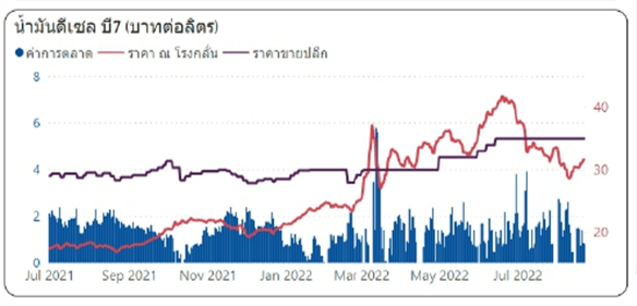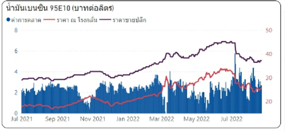 สำหรับค่าเงินบาทแข็งค่าขึ้นจากสัปดาห์ที่แล้ว 0.01 บาท/เหรียญสหรัฐฯ มาอยู่ที่ระดับเฉลี่ย 35.6742 บาท/เหรียญสหรัฐฯ ทำให้ต้นทุนน้ำมันเบนซินเพิ่มขึ้น 0.23 บาท/ลิตร และต้นทุนน้ำมันดีเซลเพิ่มขึ้น 1.30 บาท/ลิตร ส่งผลต่อค่าการตลาดเฉลี่ยถ่วงน้ำหนักของน้ำมันกลุ่มเบนซิน และน้ำมันดีเซล อยู่ที่ระดับ 1.58 บาท/ลิตร ทั้งนี้ ฐานะกองทุนน้ำมันเชื้อเพลิง ณ วันที่ 21 สิงหาคม 2565 กองทุนน้ำมันฯ มีสินทรัพย์รวม 15,608 ล้านบาท หนี้สินกองทุนฯ 133,618 ล้านบาท ฐานะกองทุนน้ำมันฯ สุทธิ -118,010 (บัญชีน้ำมัน -76,741 ล้านบาท และบัญชี LPG -41,269 ล้านบาท)