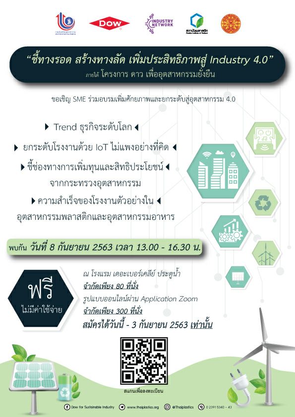 การอบรมนี้เป็นส่วนหนึ่งของโครงการ “ดาว เพื่ออุตสาหกรรมยั่งยืน” หนึ่งในโครงการ “พี่ช่วยน้อง” ผสานพลังประชารัฐยกระดับ SME ไทย สู่อุตสาหกรรม 4.0 ซึ่งนอกจากผู้เชี่ยวชาญของบริษัท ดาว แล้ว จะมีนักวิชาการและผู้เชี่ยวชาญจากหลากหลายองค์กรมาร่วมให้ความรู้ คำแนะนำ พร้อมตัวอย่างความสำเร็จที่เกิดขึ้นจริงจากโรงงานในกลุ่มอุตสาหกรรมพลาสติก และ อุตสาหกรรมแปรรูปอาหาร โดย SME ที่สนใจสามารถสมัครเข้าร่วมอบรมได้ฟรี ภายในวันที่ 3 กันยายน 2563 ติดตามรายละเอียดเพิ่มเติมได้ที่ www.thaiplastics.org และ Facebook: Dow for Sustainable Industry หรือ กรอกใบสมัครที่
