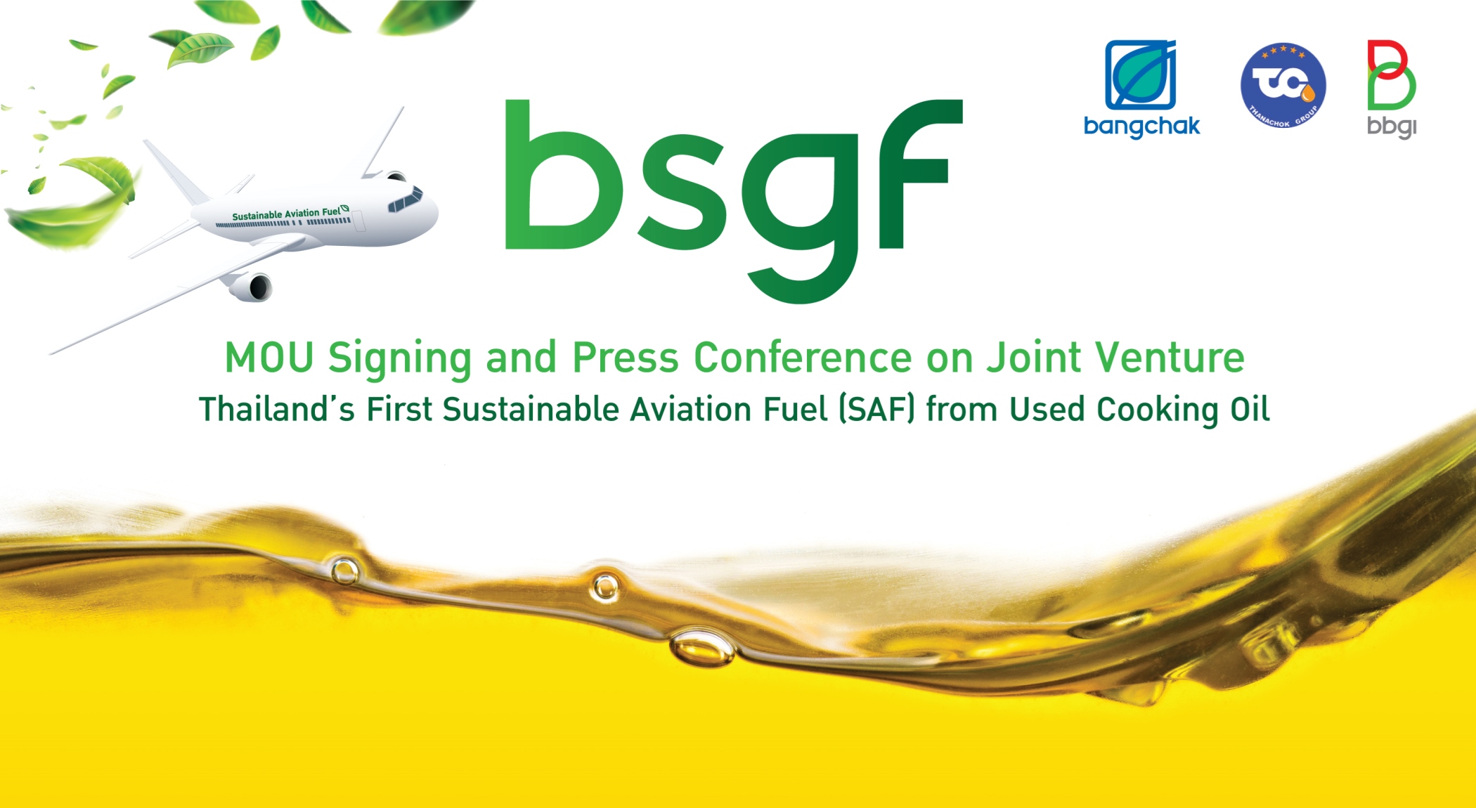 บางจากฯ - บีบีจีไอ - ธนโชค ออยล์ ไลท์ ร่วมทุนตั้งบริษัท BSGF ผลิตเชื้อเพลิงอากาศยานยั่งยืน (SAF) จากน้ำมันใช้แล้วจากการทำอาหาร รายแรกและรายเดียวในไทย พร้อมให้บริการธุรกิจการบินทั้งในและต่างประเทศ ลดการปล่อยคาร์บอนไดออกไซด์ จากการเดินทางและขนส่งทางอากาศ