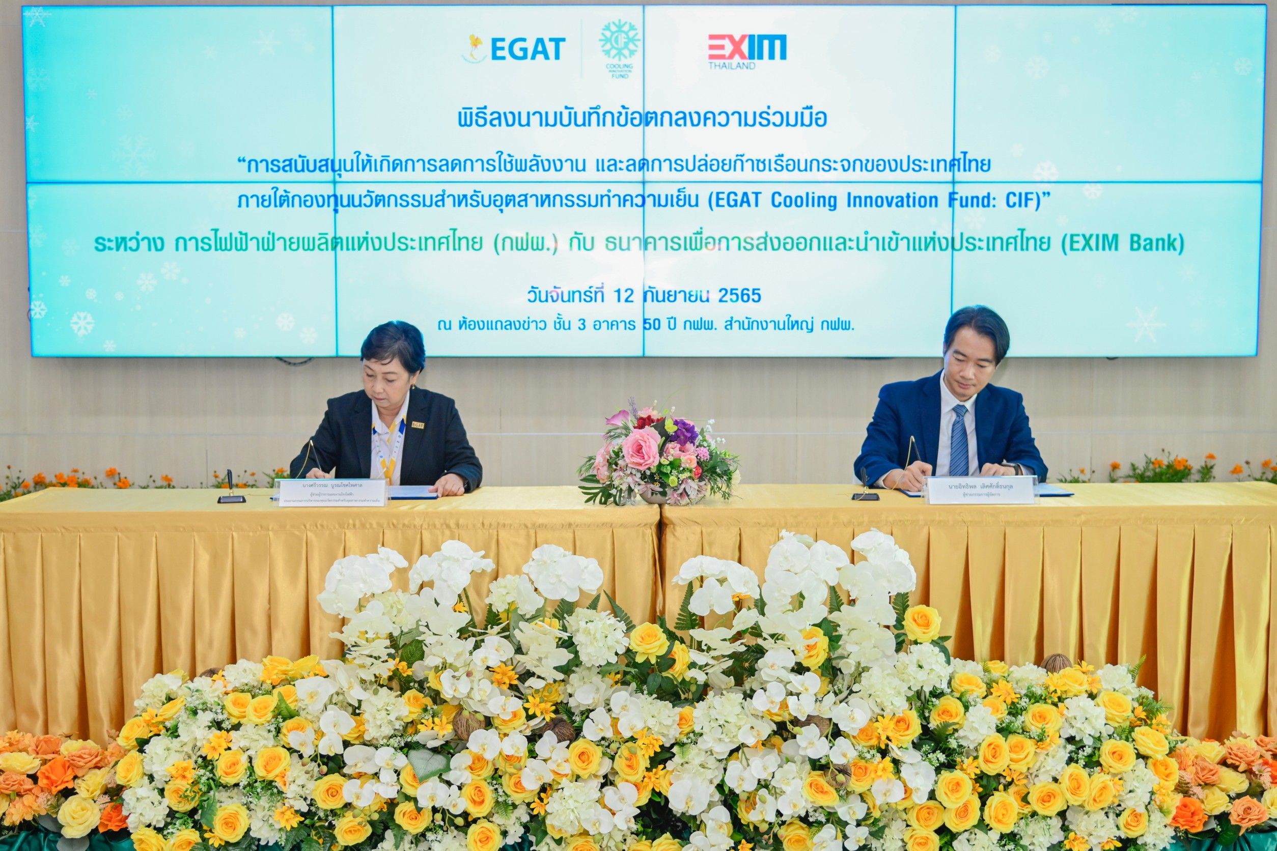นางศรีวรรณ บูรณโชคไพศาล ผู้ช่วยผู้ว่าการแผนงานโรงไฟฟ้า การไฟฟ้าฝ่ายผลิตแห่งประเทศไทย (กฟผ.) ในฐานะประธานคณะกรรมการบริหารกองทุน (EGAT Cooling Innovation Fund: CIF) เป็นผู้แทน กฟผ. ลงนามความร่วมมือสนับสนุนการลดใช้พลังงาน และลดการปล่อยก๊าซเรือนกระจกของประเทศไทย ภายใต้กองทุนนวัตกรรมสำหรับอุตสาหกรรมทำความเย็น CIF กับ นายอิทธิพล เลิศศักดิ์ธนกุล ผู้ช่วยกรรมการผู้จัดการ ธนาคารเพื่อการส่งออกและนำเข้าแห่งประเทศไทย ณ อาคาร 50 ปี กฟผ. สำนักงานใหญ่ กฟผ. จ.นนทบุรี