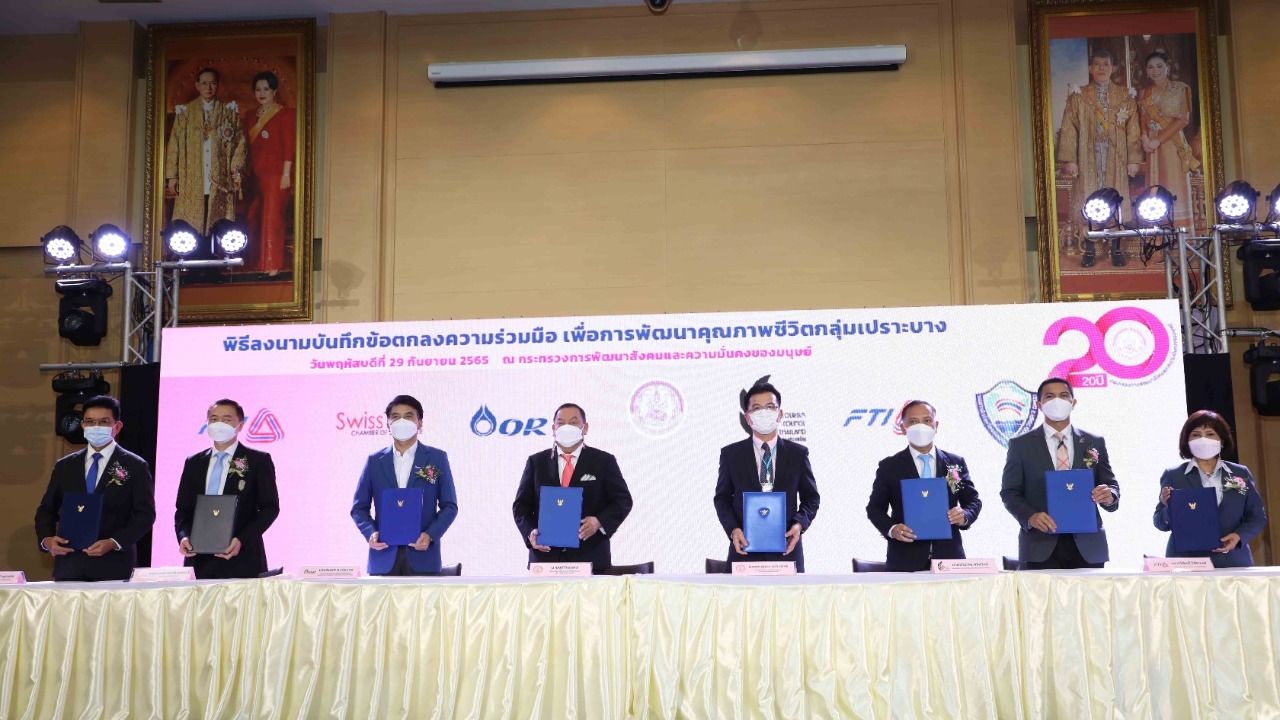 นายจุติ ไกรฤกษ์ รัฐมนตรีว่าการกระทรวงการพัฒนาสังคมและความมั่นคงของมนุษย์ เป็นประธานในพิธีลงนามบันทึกข้อตกลงความร่วมมือ “เพื่อพัฒนาคุณภาพชีวิตกลุ่มเปราะบาง” โดยมี นายธนสุนทร สว่างสาลี รองปลัดกระทรวงการพัฒนาสังคมและความมั่นคงของมนุษย์ นายสมยศ คงประเวช รองกรรมการผู้จัดการใหญ่ธุรกิจไลฟ์สไตล์ บริษัท ปตท. น้ำมันและการค้าปลีก จำกัด (มหาชน) (โออาร์) นายนฤพนธ์ เตชะวัฒนวรรณา ประธานหอการค้าสวิส-ไทย ดร.สาโรจน์ วสุวานิช ประธานสภาอุตสาหกรรมภาคตะวันออก ดร.ทวีสันต์ วิชัยวงษ์ ประธานสภาอุตสาหกรรมจังหวัดขอนแก่น นางอัมภา พรรณเกษา ที่ปรึกษากรรมการหอการค้าจังหวัดขอนแก่น และนายชำนาญ ศรีสวัสดิ์ ประธานสภาอุตสาหกรรมท่องเที่ยวแห่งประเทศไทย ร่วมลงนาม ณ อาคารกรมพัฒนาสังคมและสวัสดิการ กระทรวงการพัฒนาสังคมและความมั่นคงของมนุษย์ เพื่อส่งเสริมความร่วมมือในการพัฒนาคุณภาพชีวิตของกลุ่มเปราะบาง โดยเฉพาะครอบครัวที่มีปัญหาความยากจน รวมทั้งผู้ด้อยโอกาสในสังคม ให้มีโอกาสพัฒนาทักษะอาชีพ เข้าสู่การจ้างงาน สร้างอาชีพ และมีรายได้ที่มั่นคง เพื่อให้สามารถพึ่งพาตนเองได้อย่างยั่งยืน