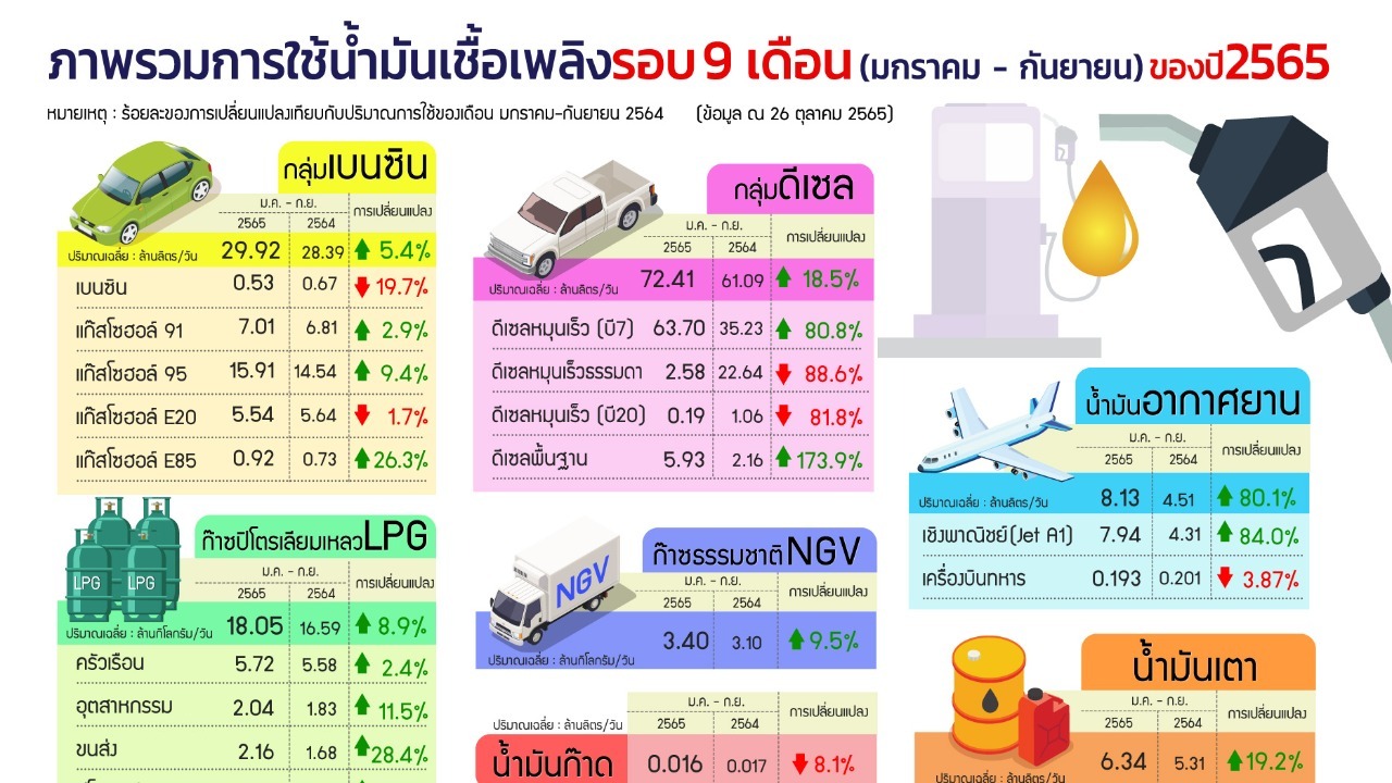 นางสาวนันธิกา ทังสุพานิช อธิบดีกรมธุรกิจพลังงาน ภาพรวมการใช้น้ำมันเชื้อเพลิงเฉลี่ยเดือนมกราคม – กันยายน 2565 อยู่ที่ 150.24 ล้านลิตร/วัน เพิ่มขึ้นเมื่อเทียบกับช่วงเดียวกันของปีก่อนร้อยละ 15.5 โดยการใช้กลุ่มดีเซลเพิ่มขึ้นร้อยละ 18.5 น้ำมันอากาศยานเชิงพาณิชย์ (Jet A1) เพิ่มขึ้นร้อยละ 84.0 น้ำมันเตาเพิ่มขึ้นร้อยละ 19.2 LPG เพิ่มขึ้นร้อยละ 8.9 และการใช้ NGV เพิ่มขึ้นร้อยละ 9.5 การใช้กลุ่มเบนซินเพิ่มขึ้นร้อยละ 5.4 ขณะที่น้ำมันก๊าดลดลงร้อยละ 8.1 ทั้งนี้ ภาพรวมการใช้น้ำมันเชื้อเพลิงเพิ่มขึ้นเนื่องจากสถานการณ์ COVID-19 มีแนวโน้มคลี่คลายไปในทิศทางที่ดี ประกอบกับมีการดำเนินมาตรการทางสาธารณสุขอย่างเข้มข้นและต่อเนื่องส่งผลให้สามารถผ่อนปรนมาตรการและข้อจำกัดต่างๆ ได้ นอกจากนี้ มาตรการกระตุ้นเศรษฐกิจโดยเฉพาะภาคการท่องเที่ยวยังเป็นปัจจัยดึงดูดให้นักท่องเที่ยวต่างชาติเข้ามาท่องเที่ยวในไทยเพิ่มขึ้น