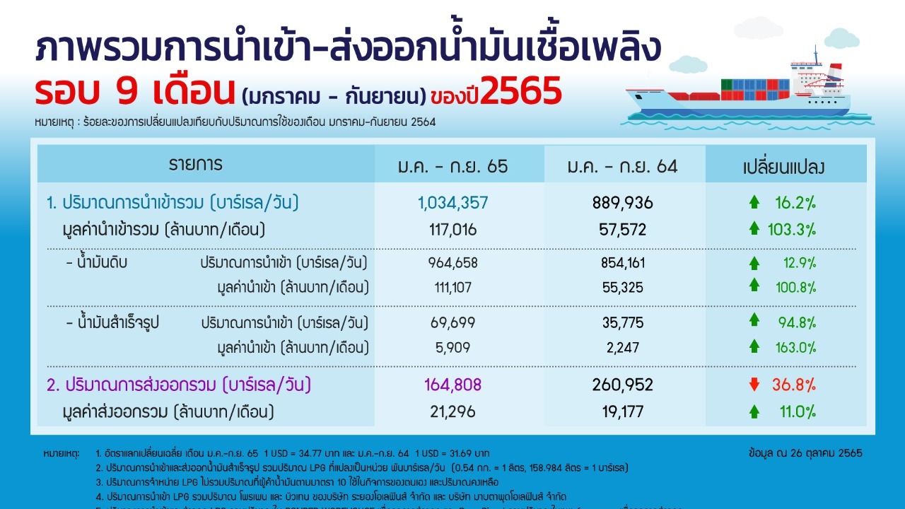 การนำเข้าน้ำมันเชื้อเพลิงเดือนมกราคม – กันยายน 2565 เฉลี่ยอยู่ที่ 1,034,357 บาร์เรล/วัน เพิ่มขึ้นจากช่วงเดียวกันของปีก่อนร้อยละ 16.2 เนื่องจากความต้องการใช้เพิ่มมากขึ้น โดยการนำเข้าน้ำมันดิบอยู่ที่ 964,658 บาร์เรล/วัน เพิ่มขึ้นร้อยละ 12.9 โดยมูลค่าการนำเข้าน้ำมันดิบอยู่ที่ 111,107 ล้านบาท/เดือน เพิ่มขึ้นร้อยละ 100.8 สำหรับการนำเข้าน้ำมันสำเร็จรูป (น้ำมันเบนซินพื้นฐาน น้ำมันดีเซลพื้นฐาน น้ำมันเตา น้ำมันอากาศยาน และ LPG) เพิ่มขึ้นมาอยู่ที่ 69,699 บาร์เรล/วัน เพิ่มขึ้นร้อยละ 94.8 คิดเป็นมูลค่าการนำเข้ารวม 5,909 ล้านบาท/เดือน