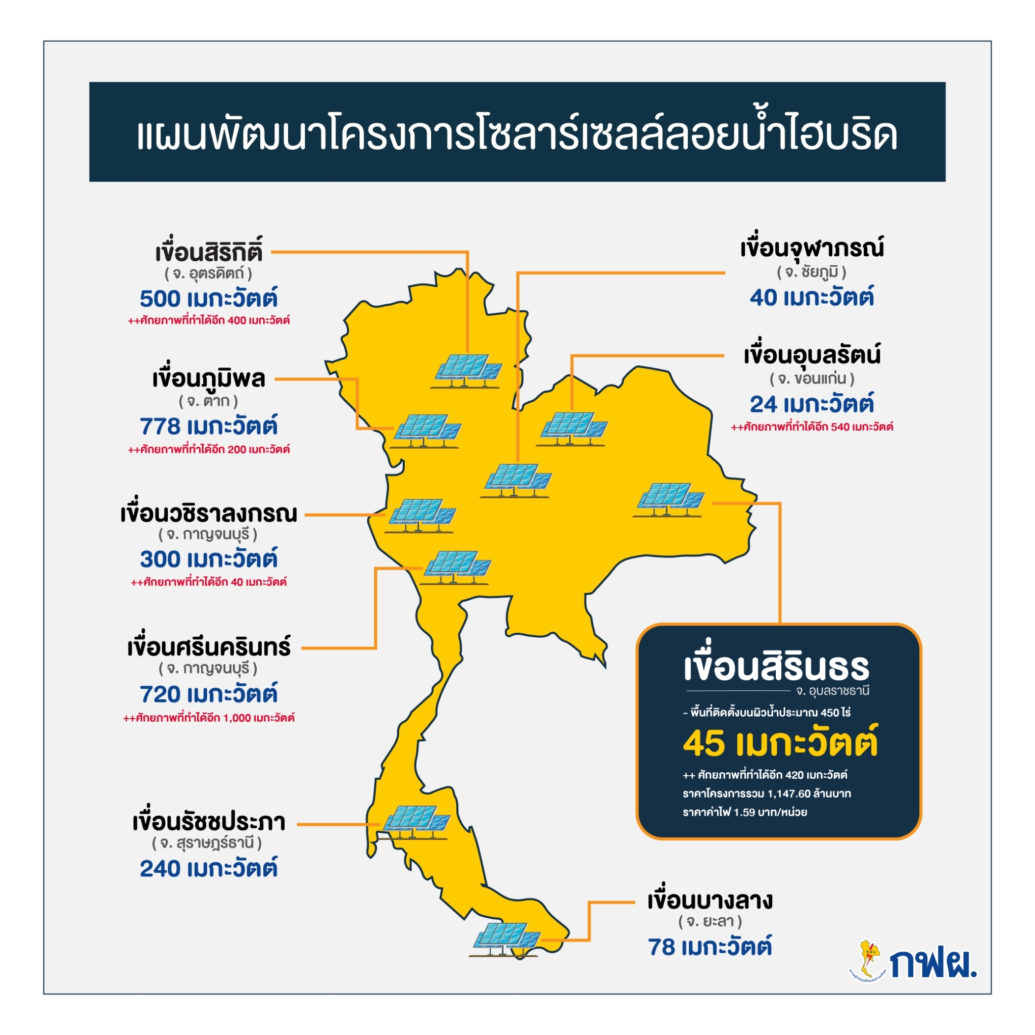 แรกเริ่ม โครงการโรงไฟฟ้าพลังงานแสงอาทิตย์ทุ่นลอยน้ำ ร่วมกับ โรงไฟฟ้าพลังน้ำเขื่อนสิรินธร จ.อุบลราชธานี หรือ Hydro-Floating Solar Hybrid เป็นโครงการนำร่องแห่งแรกของ กฟผ. และถือเป็นโซลาร์เซลล์ลอยน้ำไฮบริดกับพลังน้ำ ที่มีขนาดใหญ่ที่สุดในโลก มีแผงโซลาร์เซลล์มากถึง 144,420 แผ่น ติดตั้งอยู่บนพื้นที่ผิวน้ำประมาณ 450 ไร่ หรือเทียบเท่ากับสนามฟุตบอลประมาณ 70 สนาม โดยสามารถนำพลังงานหมุนเวียนสองประเภททั้งจาก พลังงานแสงอาทิตย์ และพลังน้ำ มาผลิตไฟฟ้าแบบผสมผสาน