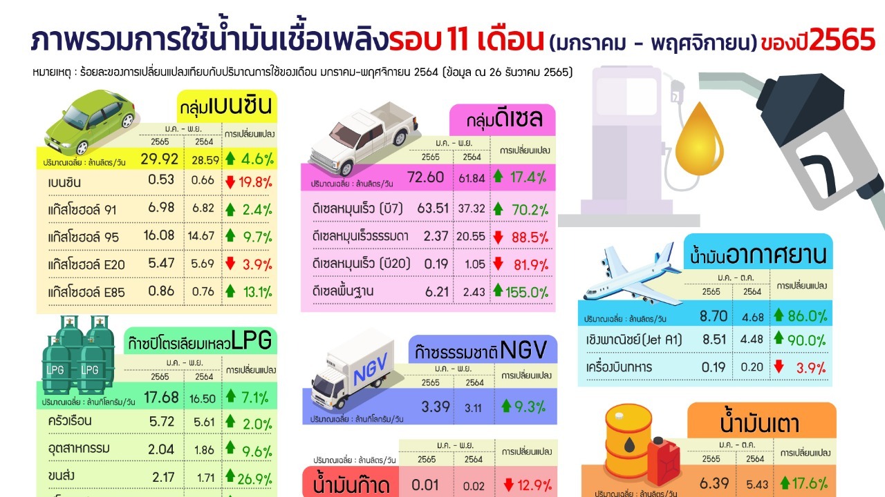 นางสาวนันธิกา ทังสุพานิช อธิบดีกรมธุรกิจพลังงาน เปิดเผยภาพรวมการใช้น้ำมันเชื้อเพลิงเฉลี่ยเดือนมกราคม – พฤศจิกายน 2565 อยู่ที่ 150.35 ล้านลิตร/วัน เพิ่มขึ้นเมื่อเทียบกับช่วงเดียวกันของปีก่อนร้อยละ 14.7 โดยการใช้กลุ่มดีเซลเพิ่มขึ้นร้อยละ 17.4 น้ำมันอากาศยานเชิงพาณิชย์ (Jet A1) เพิ่มขึ้นร้อยละ 90.0 น้ำมันเตาเพิ่มขึ้นร้อยละ 17.6 LPG เพิ่มขึ้นร้อยละ 7.1 และการใช้ NGV เพิ่มขึ้นร้อยละ 9.3 การใช้กลุ่มเบนซินเพิ่มขึ้นร้อยละ 4.6 ขณะที่การใช้น้ำมันก๊าดลดลงร้อยละ 12.9 ทั้งนี้ ภาพรวมความต้องการใช้น้ำมันเพิ่มขึ้นเป็นผลมาจากที่หลายองค์กรทั้งภาครัฐและเอกชนกลับมาทำงานตามปกติที่สำนักงาน รวมถึงการเปิดการเรียนการสอนที่สถานศึกษาตามปกติ รวมทั้งการฟื้นตัวของภาคการท่องเที่ยวที่มีจำนวนนักท่องเที่ยวเดินทางเข้าไทยอย่างต่อเนื่องโดยเฉพาะในช่วงฤดูกาลท่องเที่ยว ส่งผลให้ปริมาณความต้องการใช้น้ำมันมีแนวโน้มดีขึ้น
