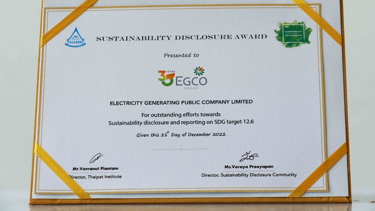บริษัท ผลิตไฟฟ้า จำกัด (มหาชน) หรือ เอ็กโก กรุ๊ป รับรางวัลเกียรติคุณ “Sustainability Disclosure Award 2022” หรือ “การเปิดเผยข้อมูลความยั่งยืน ประจำปี 2565” ต่อเนื่องเป็นปีที่ 4 จากสถาบันไทยพัฒน์ ตอกย้ำจุดยืนด้านการเปิดเผยข้อมูล ESG (Environmental, Social and Governance) ต่อสาธารณชนอย่างโปร่งใส เพื่อประโยชน์สูงสุดของผู้มีส่วนได้เสียทุกฝ่าย โดยนางสาวกุลกนก เหลืองสร้อยทอง ผู้จัดการฝ่ายเลขานุการบริษัท เอ็กโก กรุ๊ป เป็นผู้แทนองค์กร เข้ารับรางวัลดังกล่าว จากนางสาววีรญา ปรียาพันธ์ ผู้อำนวยการ ประชาคมการเปิดเผยข้อมูลความยั่งยืน (Sustainability Disclosure Community) สถาบันไทยพัฒน์ ในพิธีมอบรางวัลการเปิดเผยข้อมูลความยั่งยืน ประจำปี 2565 ที่จัดขึ้น ณ หอศิลปวัฒนธรรมแห่งกรุงเทพมหานคร เมื่อเร็ว ๆ นี้