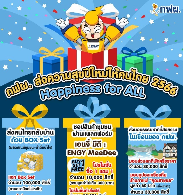ปีใหม่นี้ กฟผ. จัดใหญ่ จับมือ รฟท. 8 จังหวัด ส่งคนไทยกลับบ้านด้วย Box Set แสนกล่อง น้ำดื่ม ล้านขวด สร้างความสุข ในการเดินทางท่องเที่ยวและกลับบ้าน พร้อมมอบสิทธิ์ชอปสินค้าชุมชน 1 แถม 1 ฟรีค่าจัดส่ง และส่วนลดครึ่งราคาที่พักเขื่อน กฟผ. ทั่วประเทศ