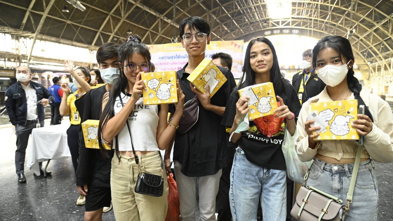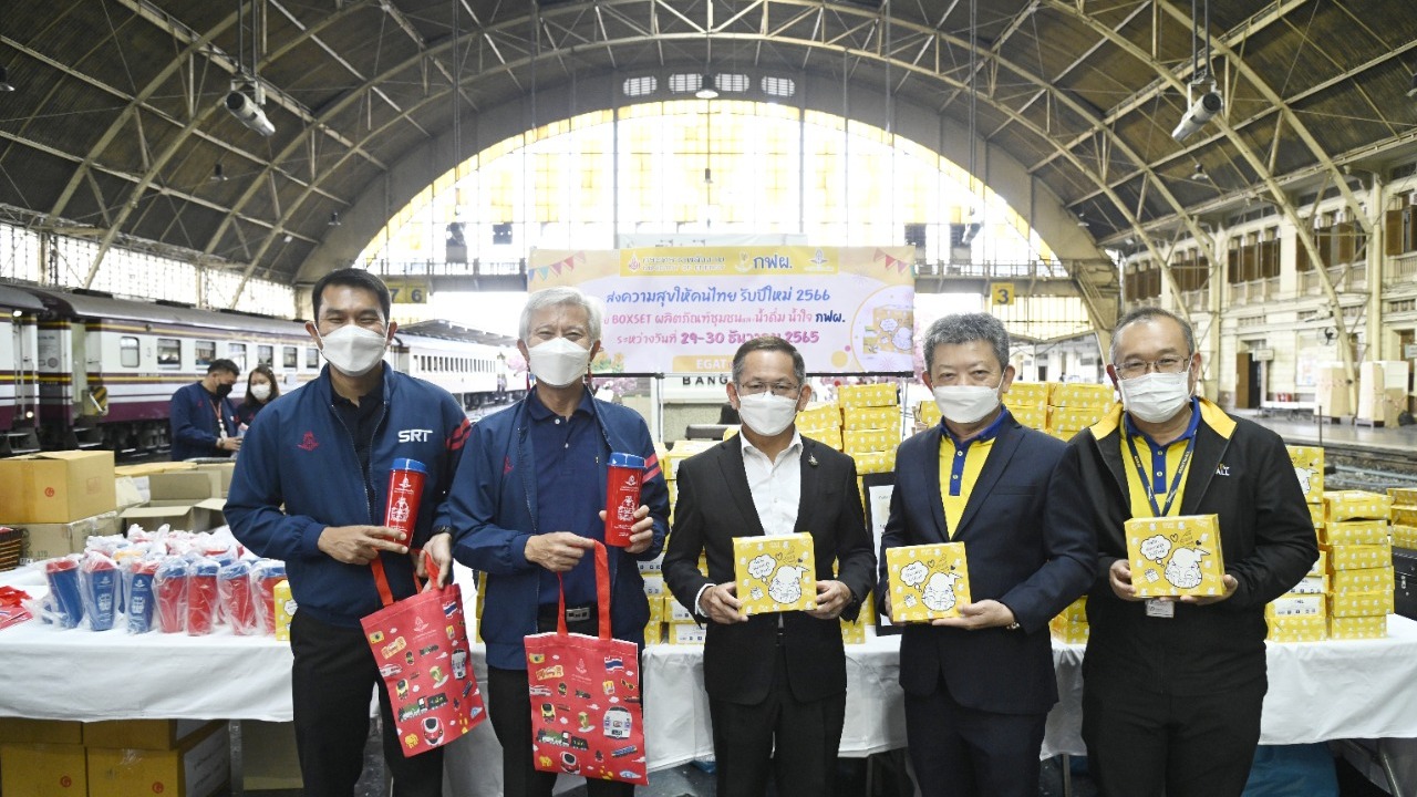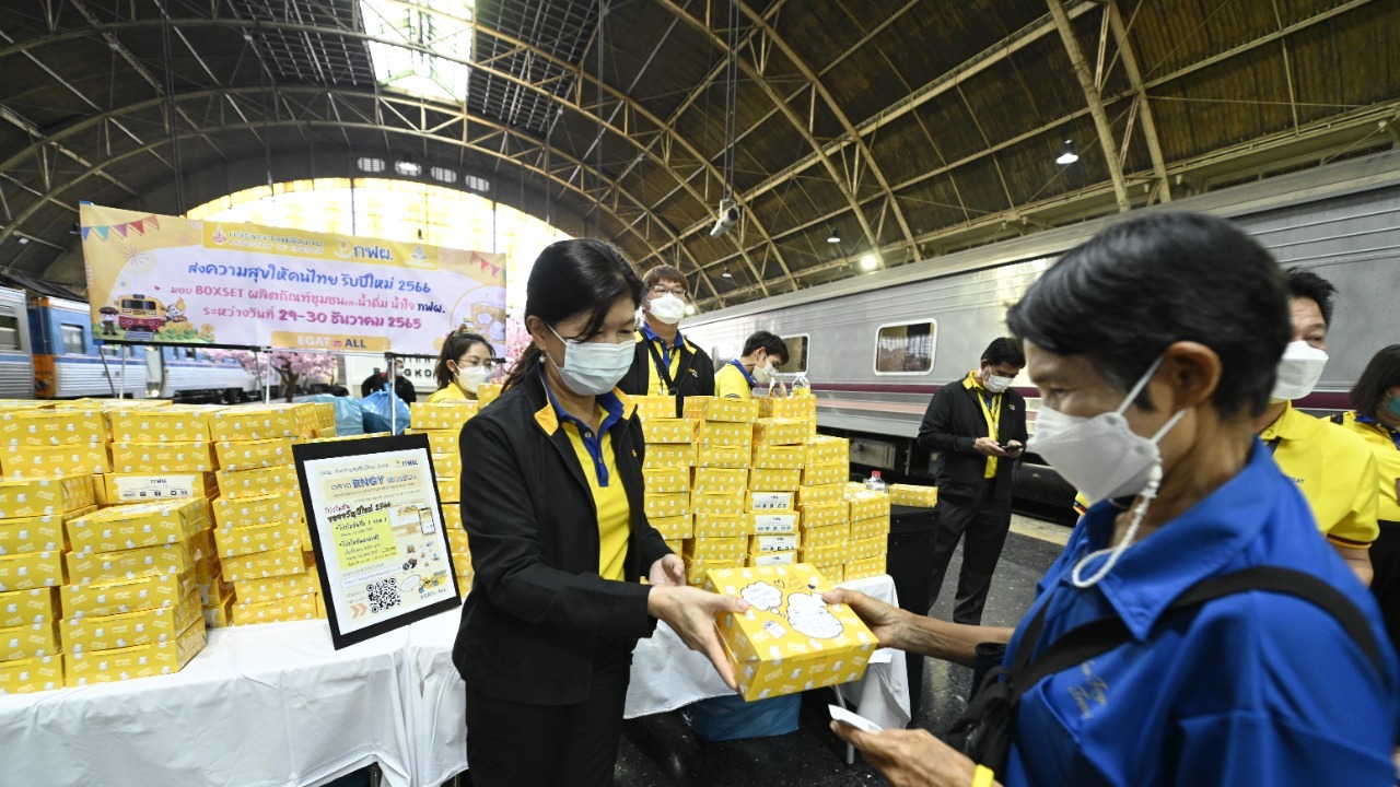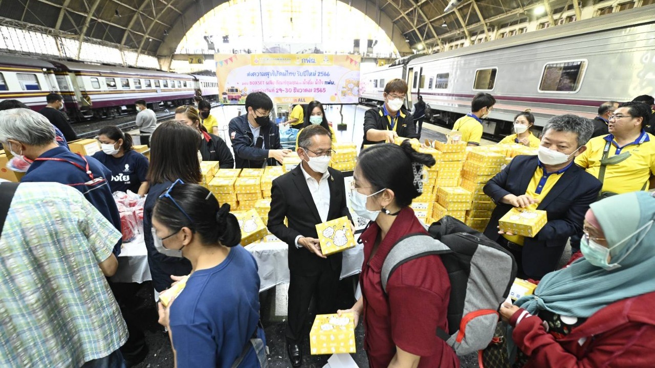 โดยได้รับเกียรติจากนายสมบูรณ์ หน่อแก้ว รองปลัดกระทรวงพลังงาน และนายอนันต์ โพธิ์นิ่มแดง รองผู้ว่าการ รฟท. ร่วมมอบ Box set ให้กับผู้เดินทางในวันที่ 29 ธันวาคม 2565 ณ สถานีกรุงเทพ (หัวลำโพง) นอกจากนี้ กฟผ. ยังได้ส่งมอบน้ำดื่ม “น้ำใจ กฟผ.” 1,000,000 ขวด ให้กับ 8 จังหวัดเส้นทางหลักเพื่อแจกจ่ายให้กับประชาชนที่เดินทางทั่วประเทศ อาทิ จ.นครราชสีมา จ.สระบุรี เส้นทางไปภาคอีสาน จ.อยุธยา จ.นครสวรรค์ เส้นทางไปภาคเหนือ เป็นต้น