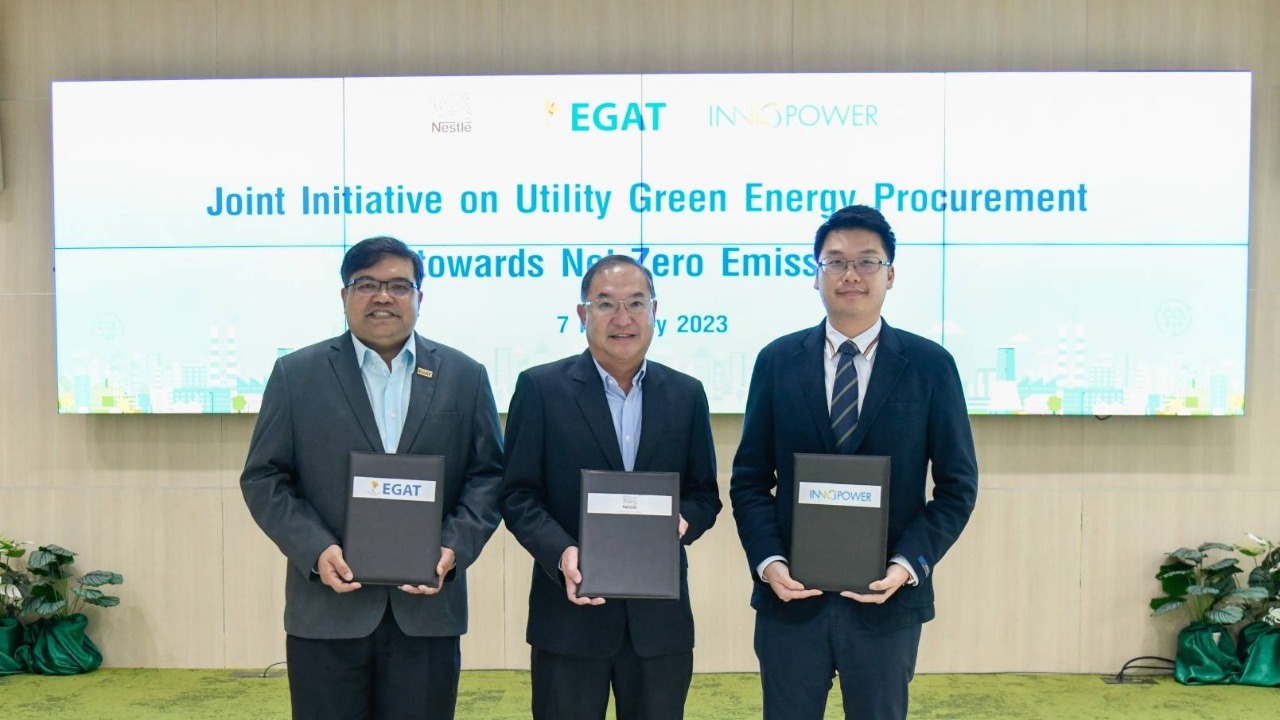 นายวิคเตอร์ เซียห์ ประธานกรรมการและประธานคณะผู้บริหาร เนสท์เล่ อินโดไชน่า พร้อมด้วยนายวฤต รัตนชื่น ผู้ช่วยผู้ว่าการวิจัย นวัตกรรม และพัฒนาธุรกิจ ในฐานะ Project Management Office การไฟฟ้าฝ่ายผลิตแห่งประเทศไทย (กฟผ.) และนายอธิป ตันติวรวงศ์ ประธานเจ้าหน้าที่บริหารบริษัท อินโนพาวเวอร์ จำกัด ร่วมแถลงความร่วมมือการจัดหาพลังงานไฟฟ้าในระดับ Utility เพื่อมุ่งสู่เป้าหมายการปล่อยก๊าซเรือนกระจกสุทธิเป็นศูนย์ ณ ห้อง Press Conference ชั้น 3 อาคาร 50 ปี กฟผ. สำนักงานกลาง กฟผ. จ.นนทบุรี