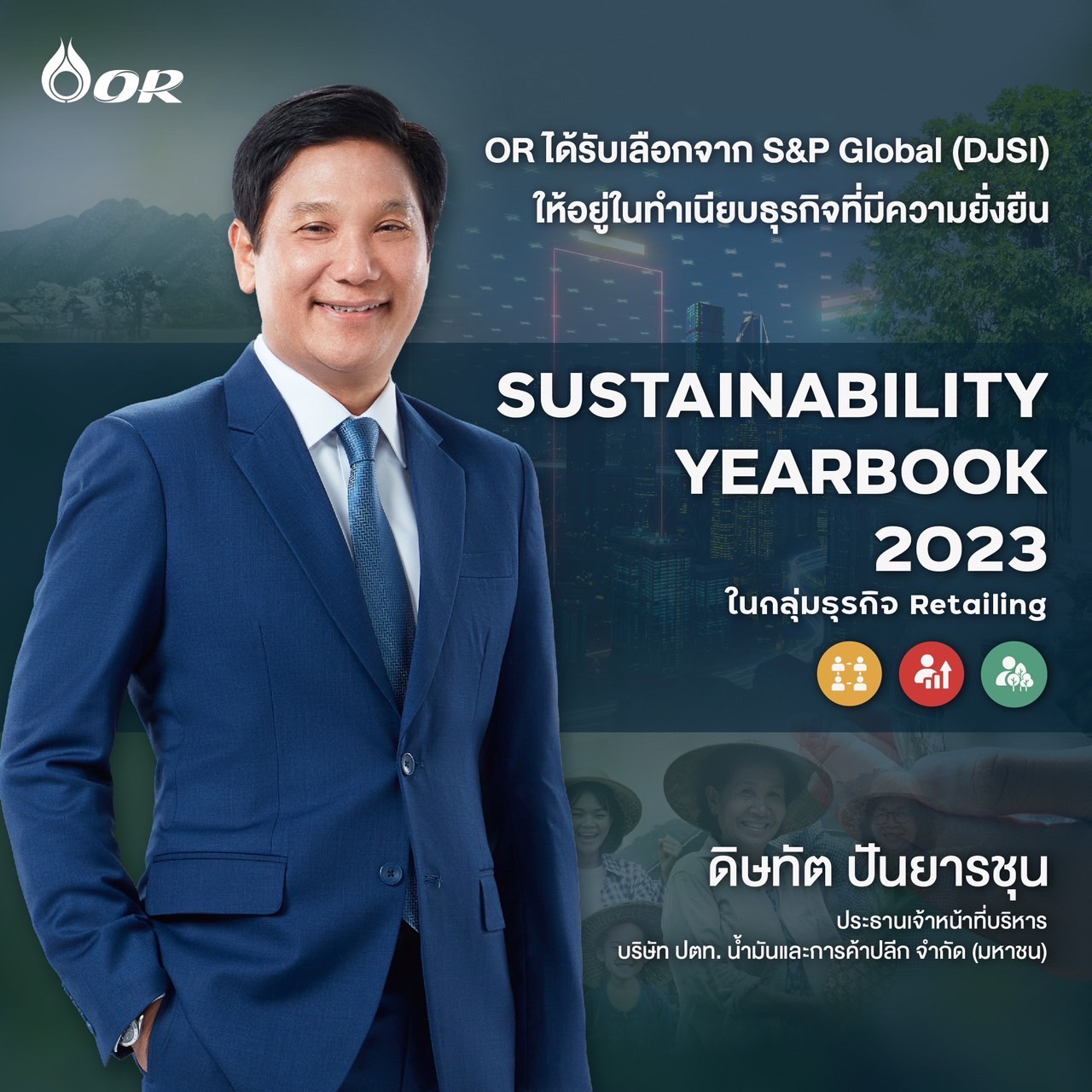OR ได้รับการคัดเลือกจาก S&P Global ให้อยู่ในทำเนียบธุรกิจที่มีความยั่งยืน “The Sustainability Yearbook 2023” กลุ่มธุรกิจ Retailing ภายหลังจาก OR เข้าร่วมประเมินความยั่งยืนในระดับสากลในปีแรกที่เข้าร่วม ตอกย้ำความเชื่อมั่นและการยอมรับจากนักลงทุน รวมถึงผู้มีส่วนได้เสียในระดับสากล