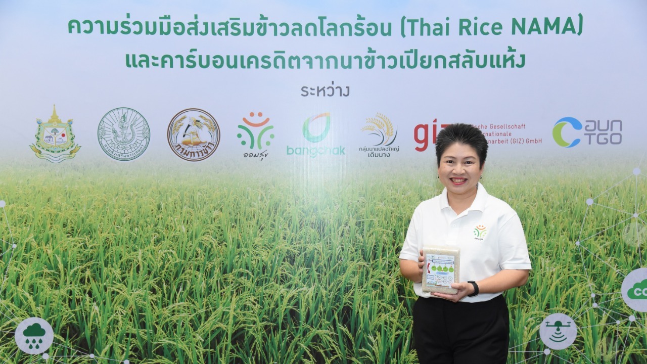 นางกลอยตา ณ ถลาง ผู้ช่วยกรรมการผู้จัดการใหญ่ สายงานสื่อสารองค์กรและกิจการเพื่อความยั่งยืน บริษัท บางจาก คอร์ปอเรชั่น จำกัด (มหาชน) และ นายชาญวิทย์ ตรังอดิศัยกุล รองกรรมการผู้จัดการใหญ่ สายงานการลงทุน บริษัท บีซีพีจี จำกัด (มหาชน) ในฐานะกรรมการ บริษัท ออมสุข วิสาหกิจเพื่อสังคม จำกัด ร่วมลงนามในบันทึกความร่วมมือส่งเสริมข้าวลดโลกร้อน (Thai Rice NAMA) และคาร์บอนเครดิตจากนาข้าวเปียกสลับแห้ง ระหว่าง บริษัท ออมสุข วิสาหกิจเพื่อสังคม จำกัด กับ วิสาหกิจชุมชนแปลงใหญ่เกษตรสมัยใหม่ ต.เดิมบาง อ.เดิม บางนางบวช จ.สุพรรณบุรี นำโดย นายถาวร คำแผง ประธานวิสาหกิจชุมชนแปลงใหญ่เกษตรสมัยใหม่ เพื่อร่วมส่งเสริมการขึ้นทะเบียนคาร์บอนเครดิตจากภาคเกษตรกรรม โดยการรับซื้อข้าวลดโลกร้อนจำนวน 40 ตัน จากการสนับสนุนกลุ่มชาวนารักโลกที่ปรับเปลี่ยนวิถีการทำนาจากวิถีดั้งเดิมมาเป็นการใช้นวัตกรรมด้วยเทคโนโลยีเลเซอร์ปรับพื้นนา และทำนาเปียกสลับแห้ง เป็นการเพิ่มประสิทธิภาพการผลิตและลดภาวะโลกร้อนจากการทำนาเพื่อการพัฒนาที่ยั่งยืน ภายใต้โครงการ “ไทยไรซ์ นามา” (Thai Rice NAMA)