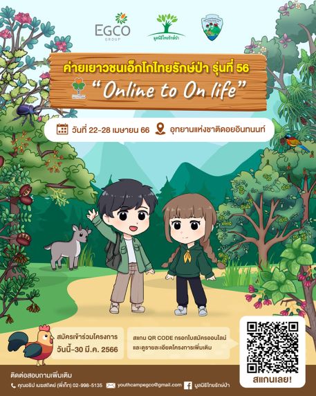 บริษัท ผลิตไฟฟ้า จำกัด (มหาชน) หรือ เอ็กโก กรุ๊ป ร่วมกับมูลนิธิไทยรักษ์ป่า องค์กรสาธารณกุศลซึ่งก่อตั้งและสนับสนุนการดำเนินงานโดยเอ็กโก กรุ๊ป และอุทยานแห่งชาติดอยอินทนนท์ ชวนเยาวชนระดับมัธยมศึกษาตอนปลาย จากโรงเรียนทุกภูมิภาคทั่วประเทศ มาร่วมเดินทางไปเรียนรู้รักษ์ป่าและสัมผัสธรรมชาติป่าต้นน้ำดอยอินทนนท์กับ “ค่ายเยาวชนเอ็กโกไทยรักษ์ป่า รุ่นที่ 56” ภายใต้แนวคิด “Online to On life” ระหว่างวันที่ 22-28 เมษายน 2566 ณ อุทยานแห่งชาติดอยอินทนนท์ จังหวัดเชียงใหม่ เยาวชนสายกรีนที่สนใจสามารถสมัครร่วมค่ายได้ 3 วิธี ได้แก่ การส่ง “เรียงความ” หรือ “คลิปวิดีโอสั้น” รวมทั้งการเล่นเกมออนไลน์ “EGCO Forest Camp” เพื่อสะสมคะแนน ตั้งแต่วันนี้ - 30 มีนาคม 2566