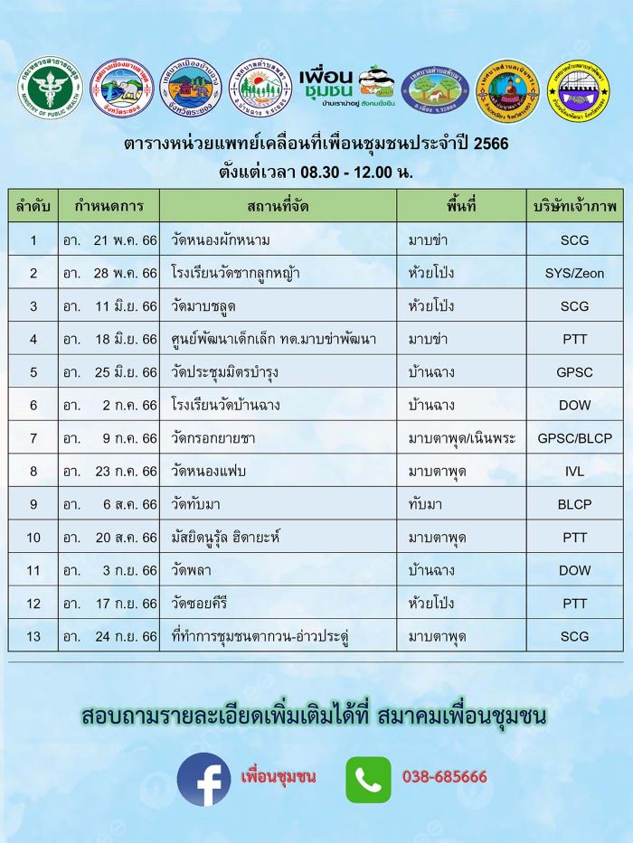 วันอาทิตย์ที่ 21 พ.ค. 2566 ณ วัดหนองผักหนาม, วันอาทิตย์ที่ 28 พ.ค. 2566 ณ โรงเรียนวัดชากลูกหญ้า, วันอาทิตย์ที่ 11 มิ.ย. 2566 ณ วัดมาบชลูด, วันอาทิตย์ที่ 18 มิ.ย. 2566 ณ ศูนย์พัฒนาเด็กเล็กฯ เทศบาลตำบลมาบข่าพัฒนา, วันอาทิตย์ที่ 25 มิ.ย. 2566 ณ วัดประชุมมิตรบำรุง, วันอาทิตย์ที่ 2 ก.ค. 2566 ณ โรงเรียนวัดบ้านฉาง, วันอาทิตย์ที่ 9 ก.ค. 2566 ณ วัดกรอกยายชา, วันอาทิตย์ที่ 23 ก.ค. 2566 ณ วัดหนองแฟบ, วันอาทิตย์ที่ 6 ส.ค. 2566 ณ วัดทับมา, วันอาทิตย์ที่ 20 ส.ค. 2566 ณ มัสยิดนูรุ้ล ฮิดายะห์, วันอาทิตย์ที่ 3 ก.ย. 2566 ณ วัดพลา, วันอาทิตย์ที่ 17 ก.ย. 2566 ณ วัดซอยคีรี, และวันอาทิตย์ที่ 24 ก.ย. 2566 ณ ที่ทำการชุมชนตากวน-อ่าวประดู่ ตั้งแต่เวลา 08.30 – 12.00 น.
