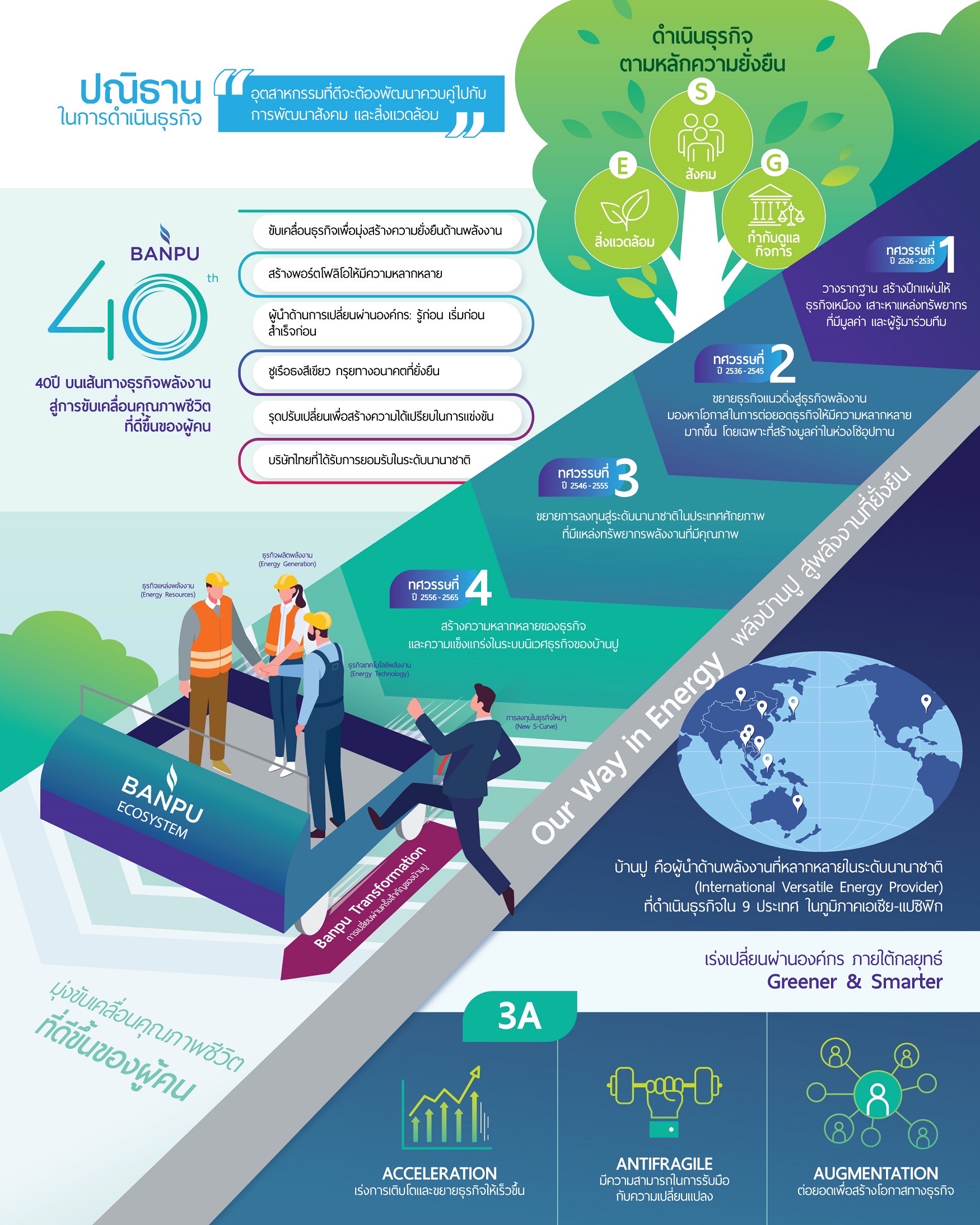 การเติบโตอย่างแข็งแกร่งและมั่นคงตลอด 4 ทศวรรษของบ้านปูนั้น นอกเหนือจากความโดดเด่นในเรื่องของระบบนิเวศทางธุรกิจที่เชื่อมโยงทุกหน่วยธุรกิจหลักเข้าด้วยกัน จนก่อให้เกิดเป็นการผสานพลังร่วมเพื่อให้ได้ประโยชน์สูงสุดในการลงทุน ลดความเสี่ยงในการทำธุรกิจ และสร้างความยั่งยืนแล้ว บ้านปูยังมีจุดแข็งคือวัฒนธรรมองค์กรที่เป็นเอกลักษณ์ เรียกว่า “บ้านปู ฮาร์ท (Banpu Heart)” ที่หลอมรวมให้พนักงานทุกคนในทุกประเทศมุ่งไปสู่เป้าหมายเดียวกัน ทั้งหมดนี้ทำให้บ้านปูสามารถส่งมอบ “อนาคตพลังงานเพื่อความยั่งยืน (Smarter Energy for Sustainability)” ในฐานะผู้นำด้านพลังงานที่หลากหลายในระดับนานาชาติ เพื่อสร้างคุณค่าให้กับผู้มีส่วนได้เสียทุกกลุ่ม และขับเคลื่อนคุณภาพชีวิตที่ดีขึ้นให้กับผู้คน