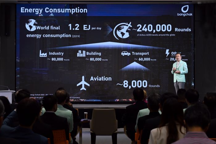 นายชัยวัฒน์ โควาวิสารัช ประธานเจ้าหน้าที่บริหารกลุ่มบริษัทบางจากและกรรมการผู้จัดการใหญ่ บริษัท บางจาก คอร์ปอเรชั่น จำกัด (มหาชน) กล่าวว่า “เป็นเวลาเกือบ 4 ทศวรรษแล้วที่บางจากฯ ก่อตั้งขึ้นด้วยภารกิจสร้างความมั่นคงด้านพลังงานให้กับประเทศและความยั่งยืนให้กับสังคมและสิ่งแวดล้อม ในวันนี้เรายังคงมุ่งมั่นดำเนินธุรกิจเพื่อตอบสนองภารกิจดังกล่าว ภายใต้วิสัยทัศน์ “รังสรรค์โลกยั่งยืนด้วยนวัตกรรมสีเขียว” โดยมีกลุ่มธุรกิจโรงกลั่นน้ำมันและการค้าน้ำมันเป็นหนึ่งในธุรกิจหลัก ซึ่งธุรกิจนี้ได้มีการพัฒนาผ่าน generation ต่าง ๆ จากเชื้อเพลิงฟอสซิลในช่วงเริ่มต้น สู่ยุคที่ 1 นำเอทานอลหรือไบโอดีเซลมาผสมในเชื้อเพลิงฟอสซิลเป็นรายแรกในประเทศไทย จนเป็นที่ยอมรับในฐานะ ‘ผู้นำพลังงานทดแทน’ และกำลังก้าวสู่ความเป็น ‘ผู้นำพลังงานแห่งอนาคต’ เข้าสู่ยุคที่ 2 ของโรงกลั่นด้วยการบุกเบิกการผลิตน้ำมันสำหรับอากาศยานที่จะช่วยลดการปล่อยก๊าซคาร์บอนไดออกไซด์สู่ชั้นบรรยากาศได้ถึง 80% ตลอดวงจรชีวิต เมื่อเทียบกับเชื้อเพลิงอากาศยานที่ผลิตจากฟอสซิล และเป็นการต่อยอดน้ำมันพืชที่ใช้แล้วจากการปรุงอาหารผ่านโครงการ “ทอดไม่ทิ้ง”