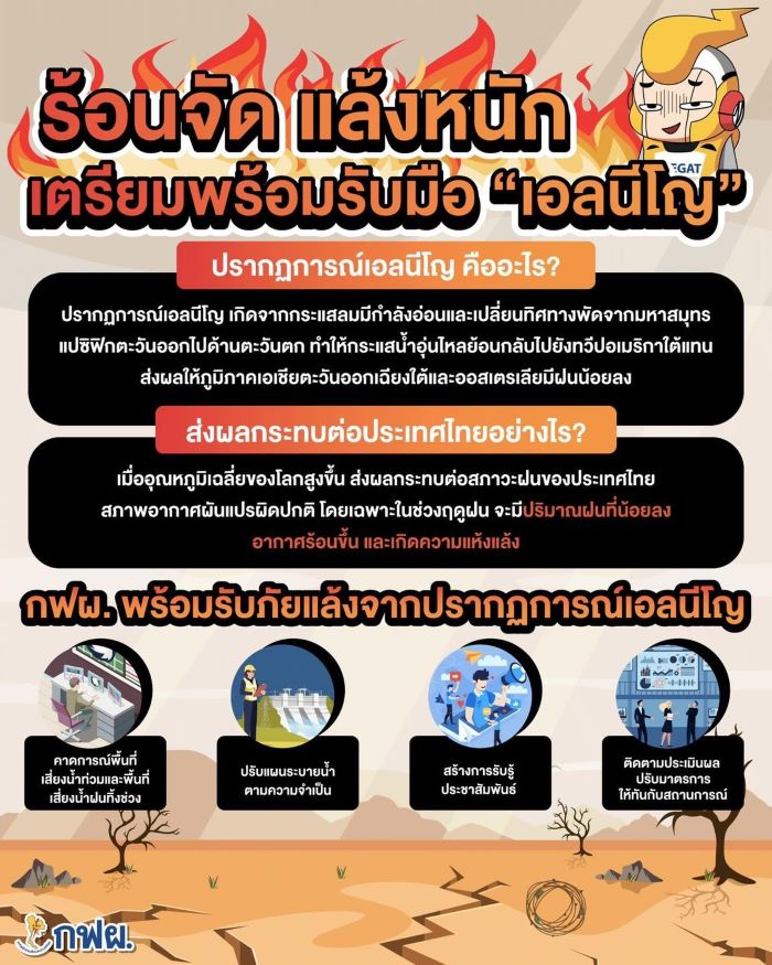 กฟผ. ร่วมกับทุกภาคส่วนเตรียมแผนบริหารจัดการน้ำและโรงไฟฟ้ารับมือสภาวะเอลนีโญ เฝ้าระวังเขื่อนที่เสี่ยงน้ำน้อย ปรับแผนการกักเก็บและระบายน้ำให้มีปริมาณสำรองเพียงพอต่อการอุปโภคบริโภคและรักษาระบบนิเวศจนถึงปีหน้า รวมถึงปรับมาตรการการใช้น้ำของโรงไฟฟ้าให้มีประสิทธิภาพเพื่อผลิตไฟฟ้าอย่างมั่นคง ประชาชนสบายใจมีไฟฟ้าใช้อย่างมีคุณภาพ