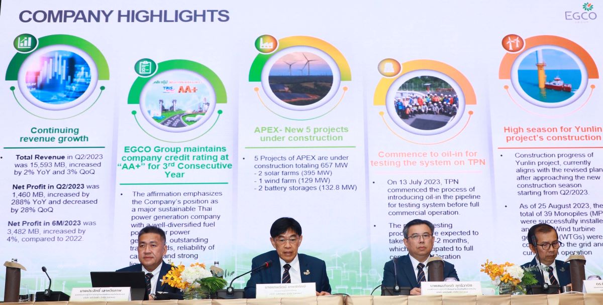 สำหรับผลการดำเนินงานในช่วง 6 เดือนแรกของปี 2023 เอ็กโก กรุ๊ป มีกำไรสุทธิจำนวน 3,482 ล้านบาท เพิ่มขึ้น 4% เมื่อเทียบกับช่วงเดียวกันของปีที่แล้ว โดยในช่วงครึ่งปีแรก เอ็กโก กรุ๊ป ยังคงสามารถบริหารจัดการพอร์ตโฟลิโอโรงไฟฟ้าและต้นทุนเชื้อเพลิงของโรงไฟฟ้าทุกแห่งอย่างมีประสิทธิภาพ โดยเฉพาะโรงไฟฟ้าขนาดใหญ่ทั้งในและต่างประเทศ ทำให้สามารถสร้างรายได้จากการขายไฟฟ้าเพิ่มขึ้น รวมทั้งความสามารถในการบริหารจัดการโครงการที่อยู่ระหว่างการก่อสร้างให้เป็นไปตามแผนงาน ดังเช่น โครงการโรงไฟฟ้าหยุนหลิน ในไต้หวัน ที่มีความคืบหน้าในการก่อสร้างได้ตามแผนงาน โดยปัจจุบัน (ณ วันที่ 25 สิงหาคม 2023) สามารถติดตั้งเสากังหัน (Monopiles) แล้วเสร็จจำนวน 39 ต้น และติดตั้งเครื่องผลิตไฟฟ้าจากใบพัดกังหัน (Wind Turbine Generators) ที่สามารถจ่ายไฟฟ้าเข้าระบบแล้ว จำนวน 22 ต้น